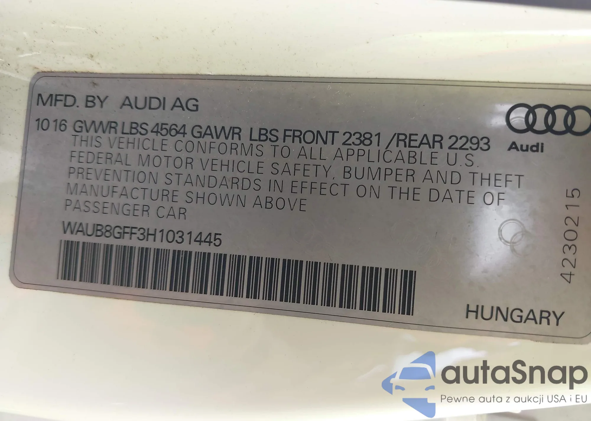 VIN: WAUB8GFF3H1031445