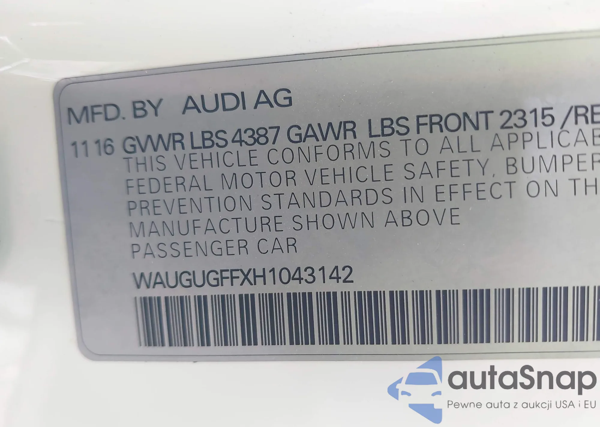 • VIN: WAUGUGFFXH1043142