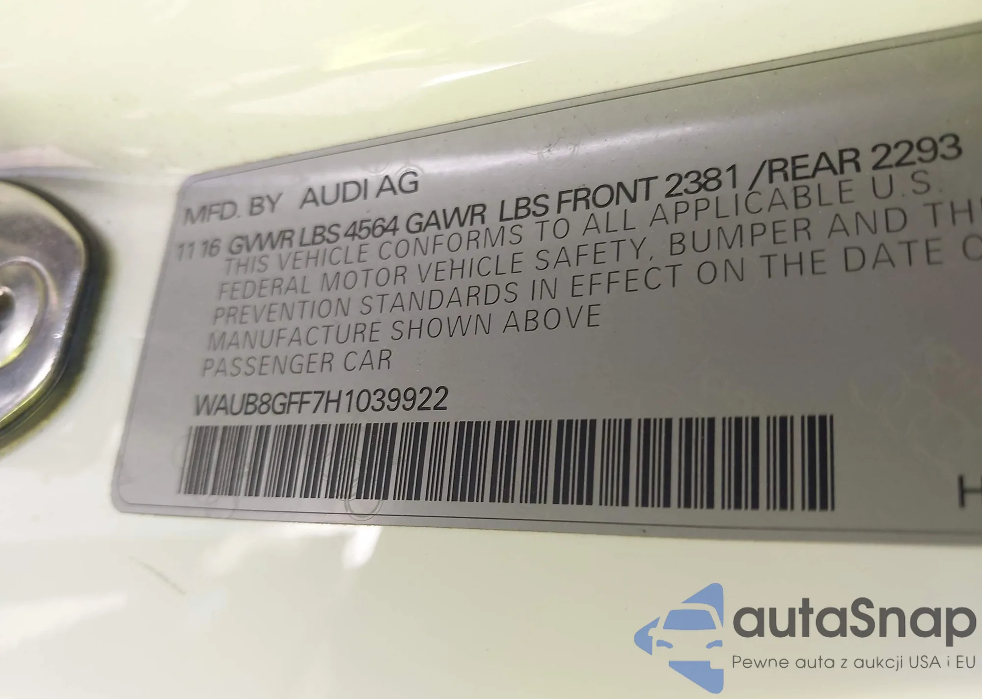 Samochód Audi A3 2017 (VIN WAUB8GFF7H1039922) ma dokumenty uniemożliwiające rejestrację. Mogą pojawić się trudności przy eksporcie i rejestracji. Skontaktuj się z ekspertami AutaSnap w celu znalezienia alternatywy.