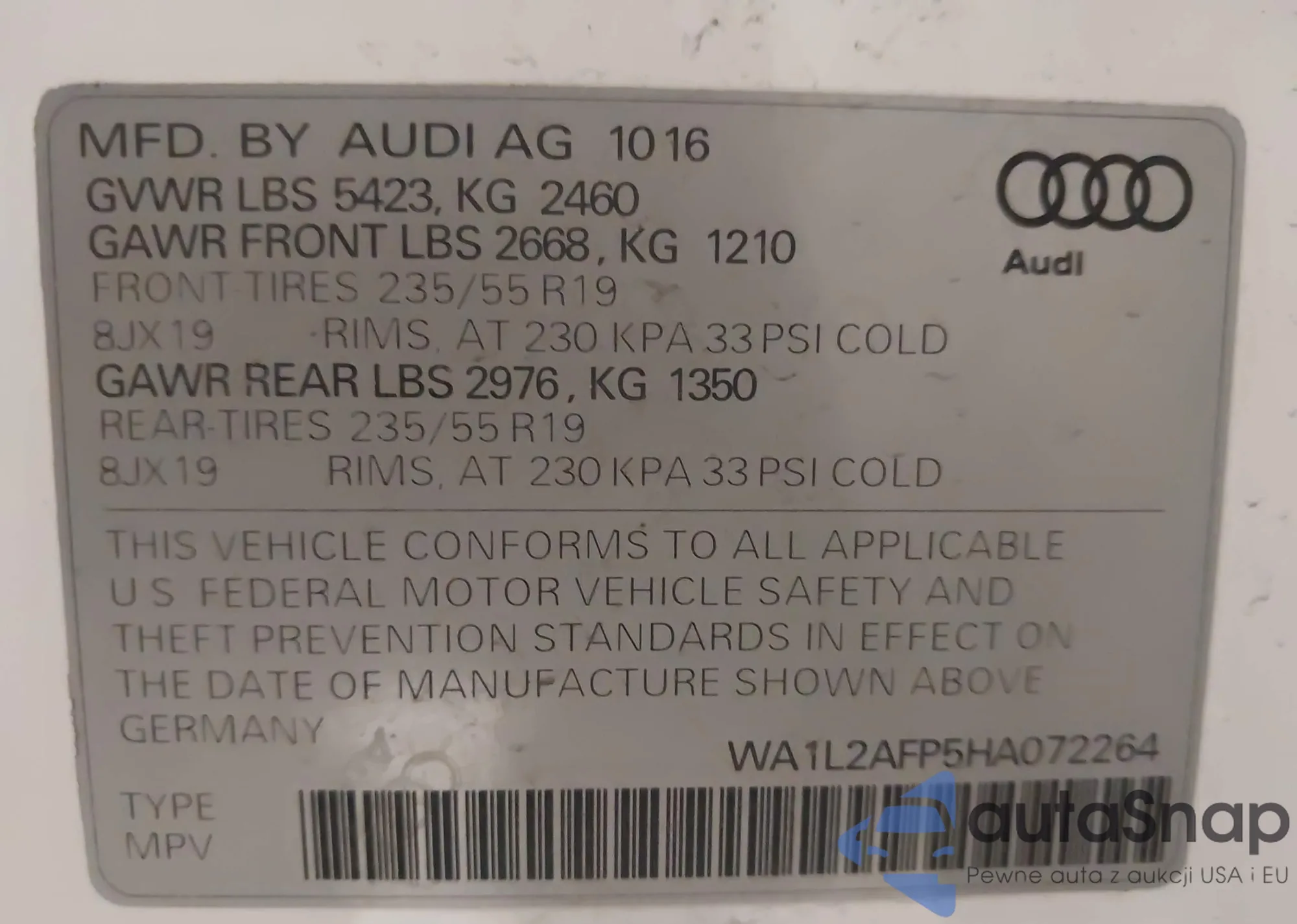 Samochód Audi Q5 2017 (VIN WA1L2AFP5HA072264) nie był wcześniej licytowany. Dokumenty są czyste, przebieg odpowiada lub jest niższy niż średnia rynku. Sprzedaje go firma ubezpieczeniowa – polecamy zakup. Dostawa do portu zajmie ok. 6–8 tygodni.