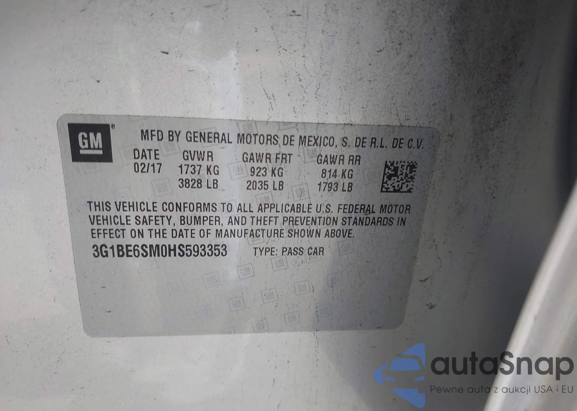 VIN: 3G1BE6SM0HS593353