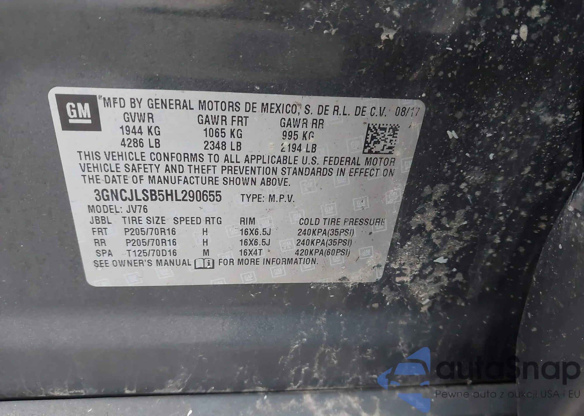 Samochód Chevrolet Trax 2017 (VIN 3GNCJLSB5HL290655) nie był wcześniej licytowany. Dokumenty są czyste, przebieg odpowiada lub jest niższy niż średnia rynku. Sprzedaje go firma ubezpieczeniowa – polecamy zakup. Dostawa do portu zajmie ok. 6–8 tygodni.