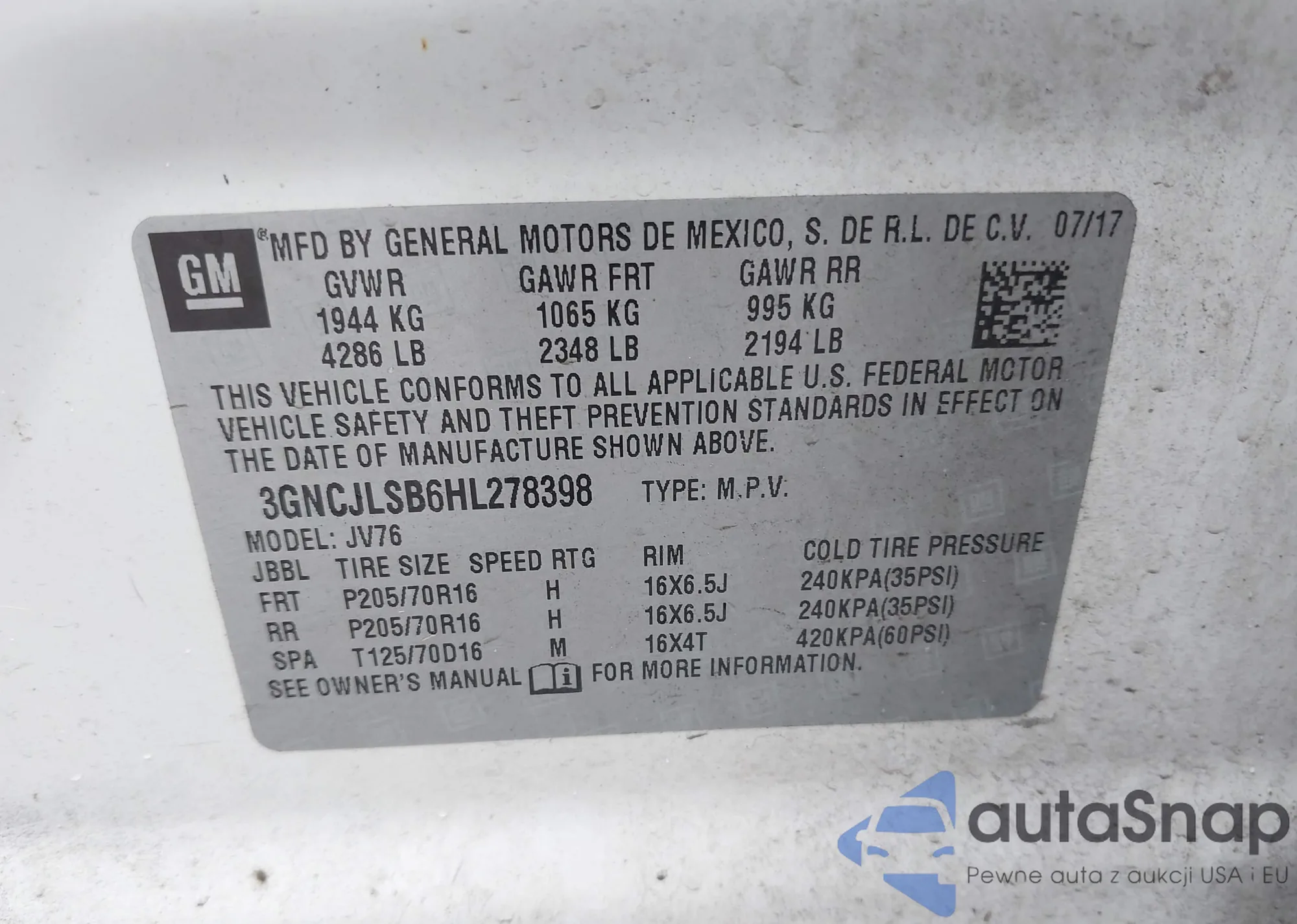 VIN: 3GNCJLSB6HL278398