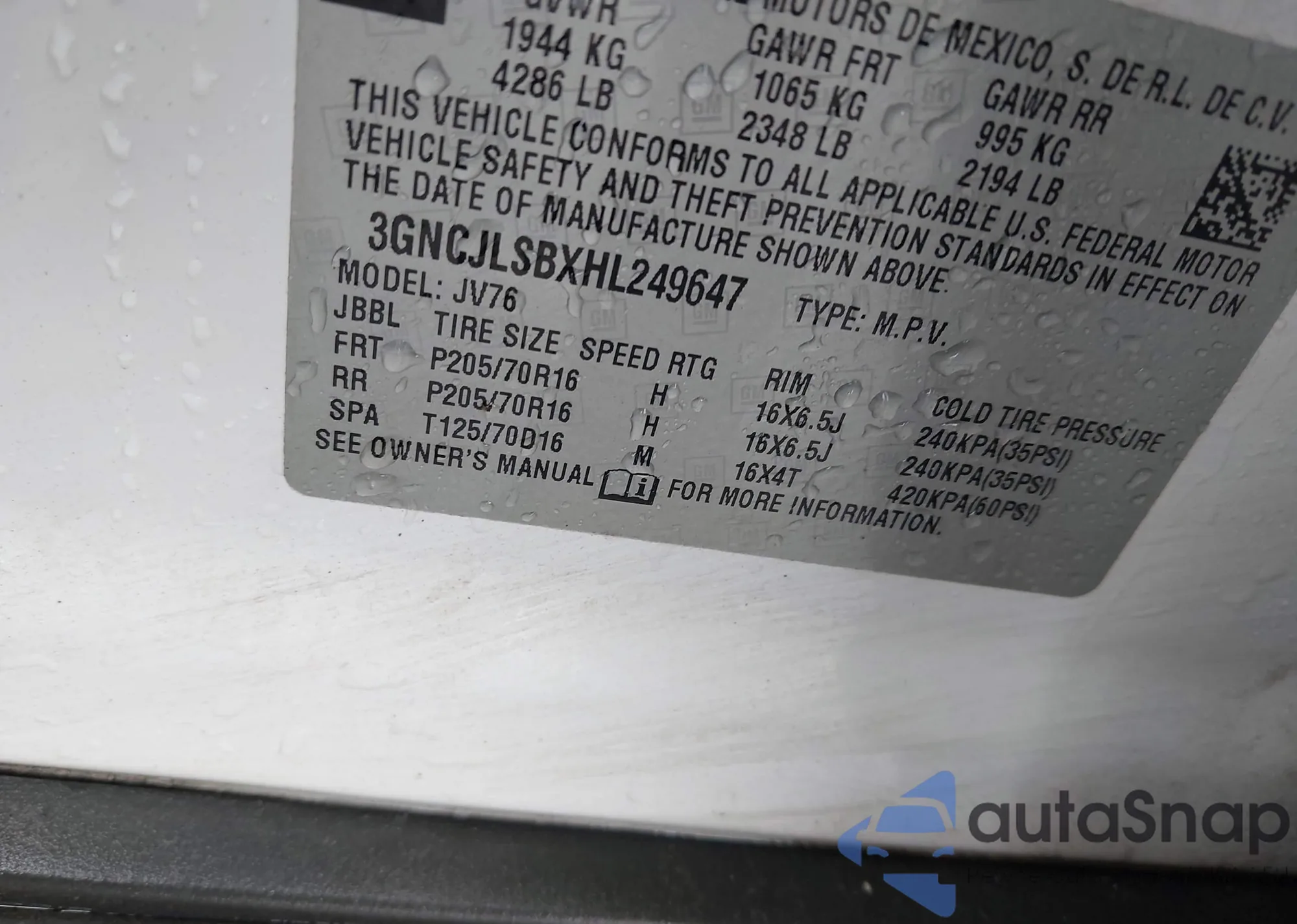 VIN: 3GNCJLSBXHL249647