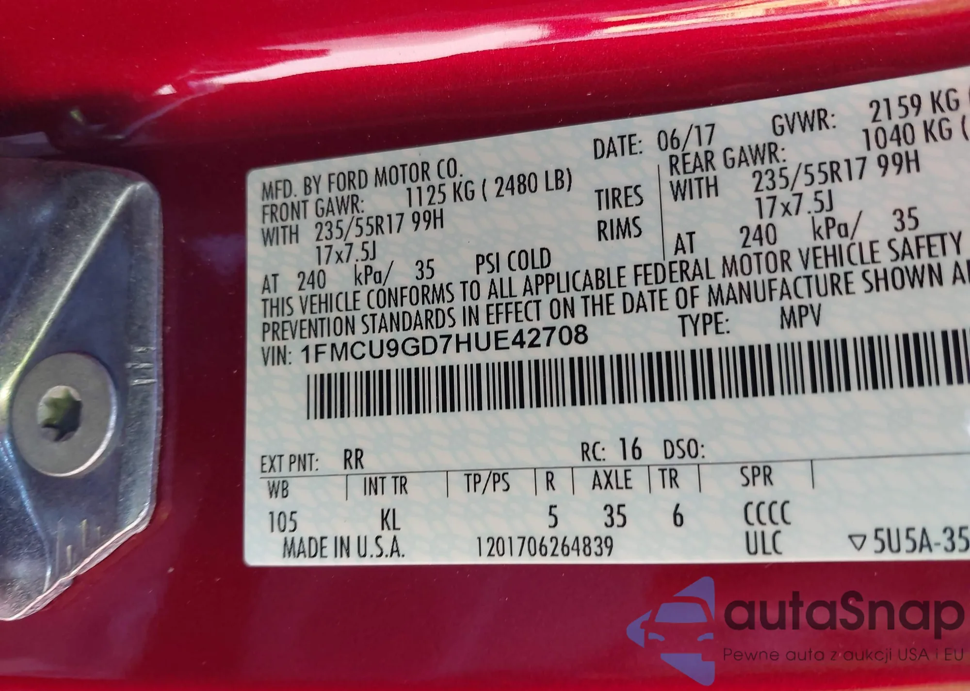 VIN: 1FMCU9GD7HUE42708
