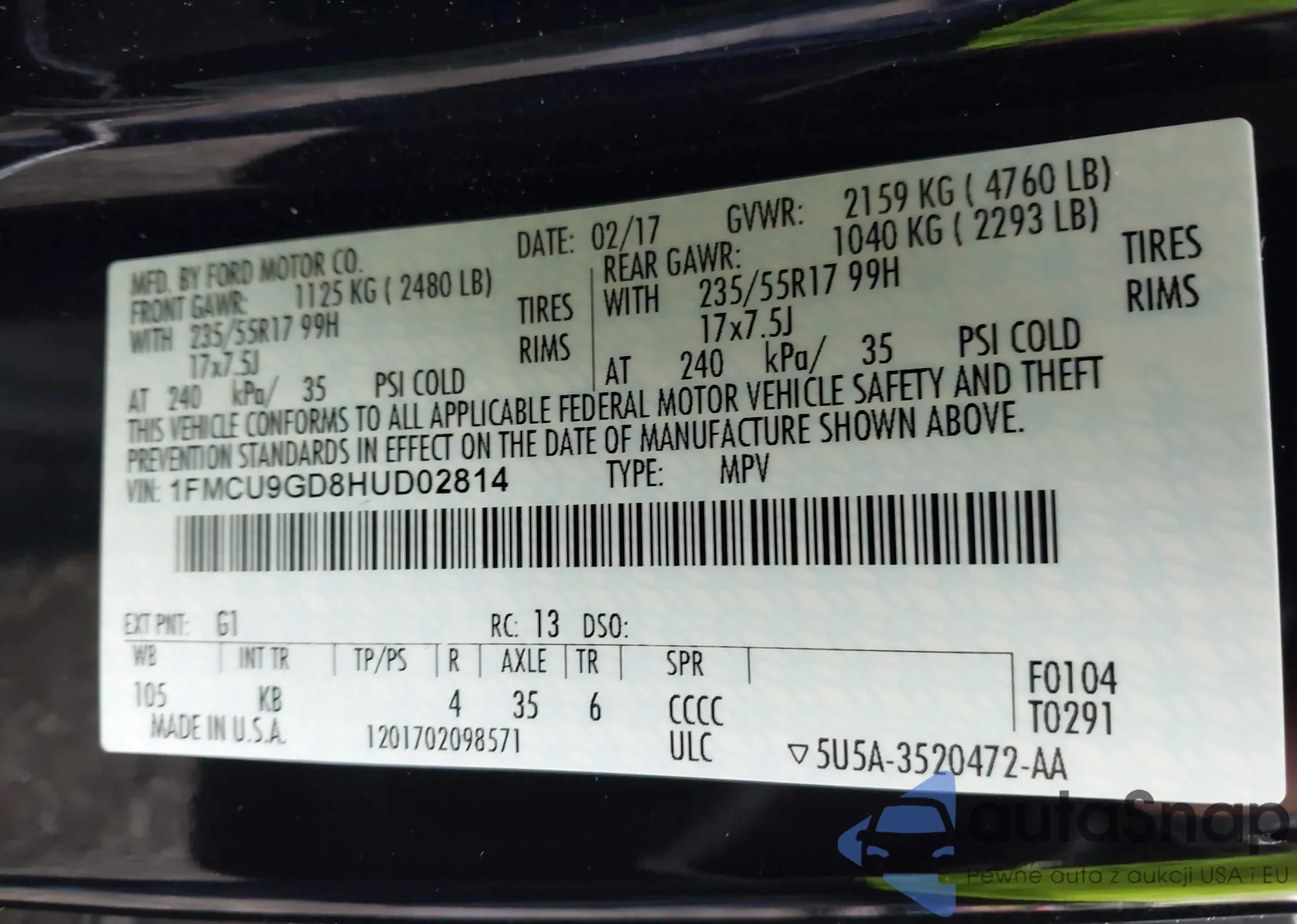 VIN: 1FMCU9GD8HUD02814