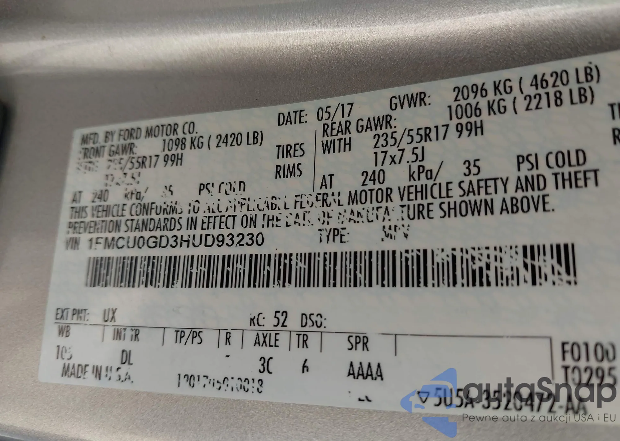 VIN: 1FMCU0GD3HUD93230