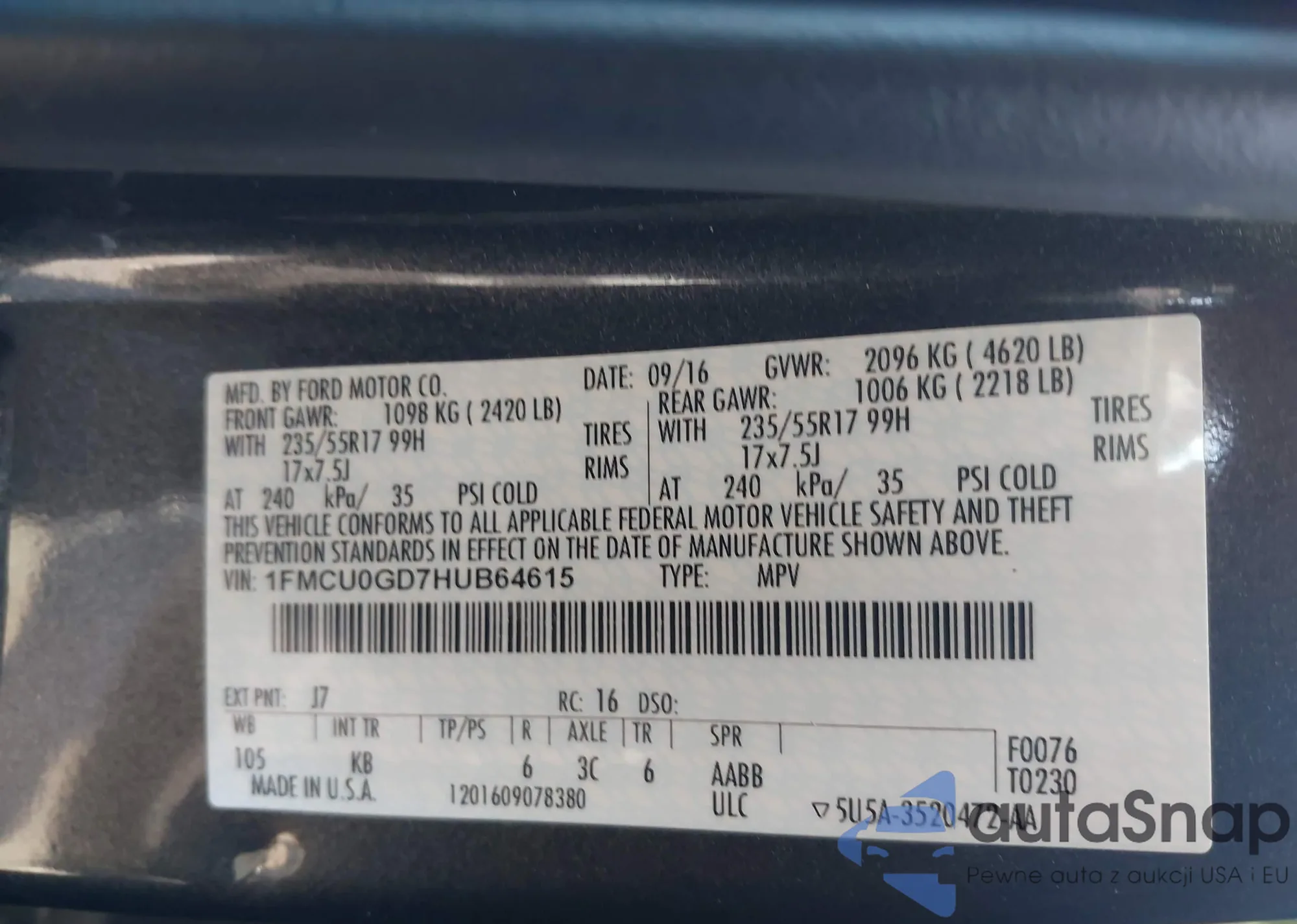 • VIN: 1FMCU0GD7HUB64615
