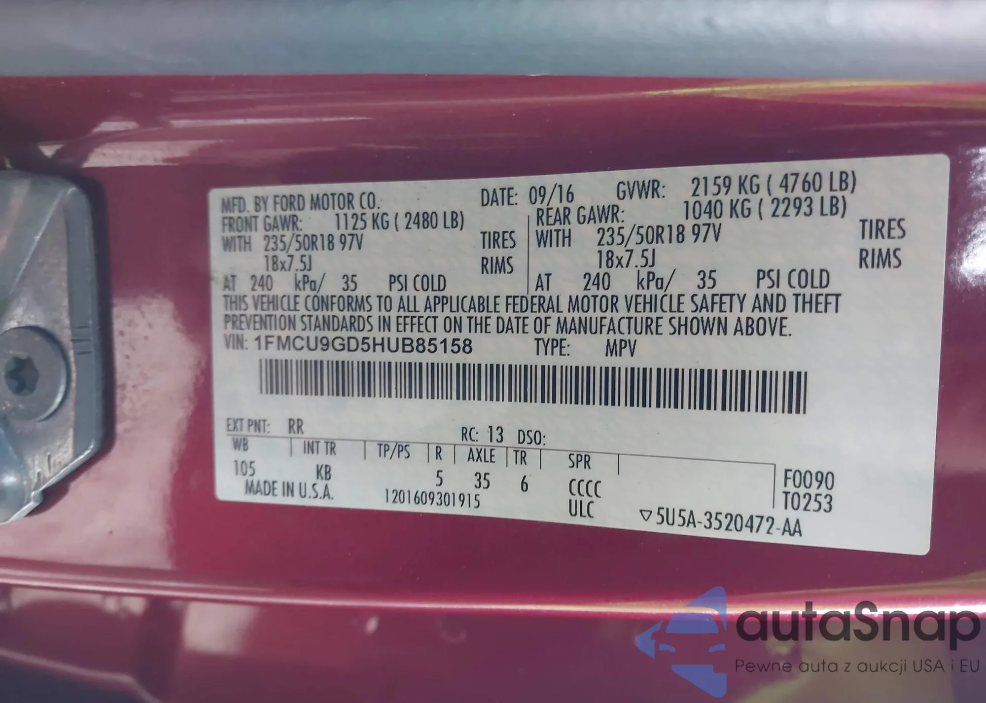 Samochód Ford Escape 2017 (VIN 1FMCU9GD5HUB85158) nie był wcześniej licytowany. Dokumenty są czyste, przebieg odpowiada lub jest niższy niż średnia rynku. Sprzedaje go firma ubezpieczeniowa – polecamy zakup. Dostawa do portu zajmie ok. 6–8 tygodni.