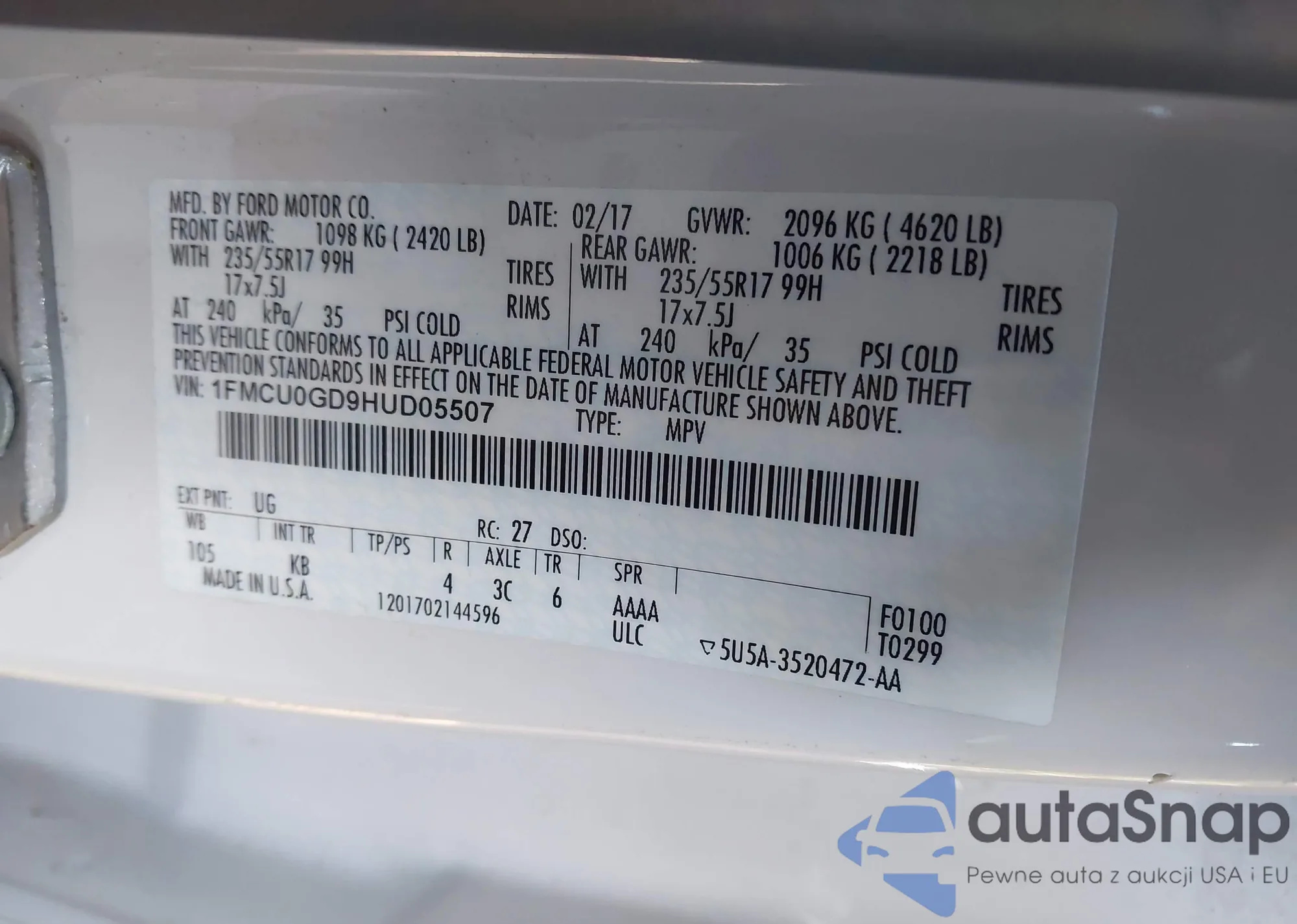 VIN: 1FMCU0GD9HUD05507
