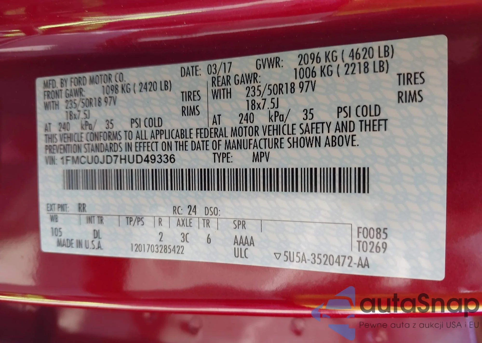 VIN: 1FMCU0JD7HUD49336