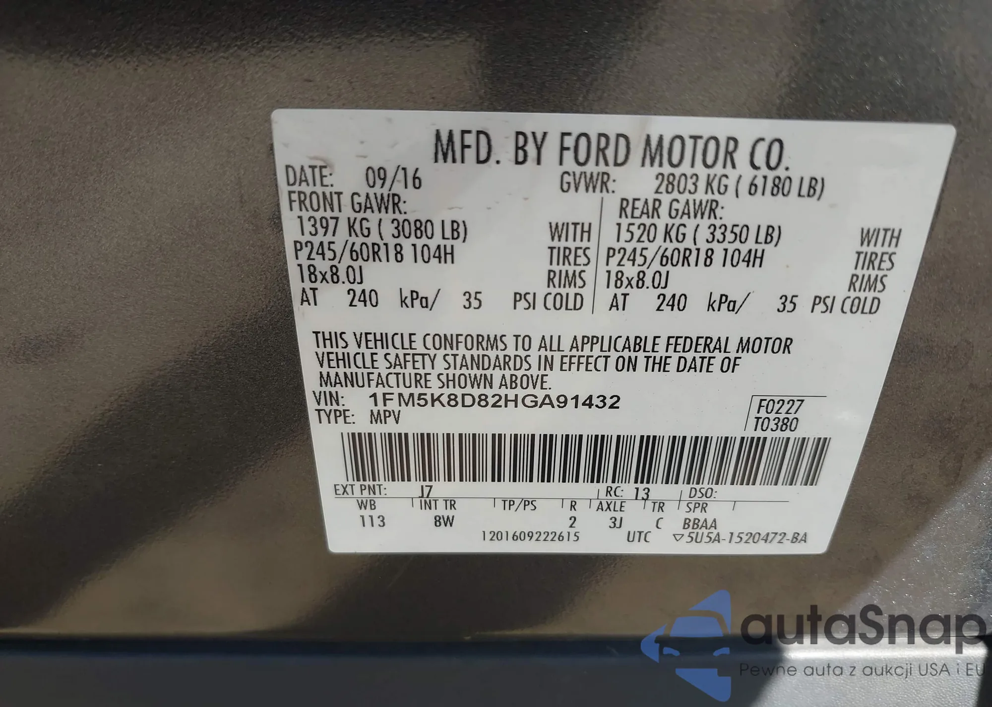 VIN: 1FM5K8D82HGA91432