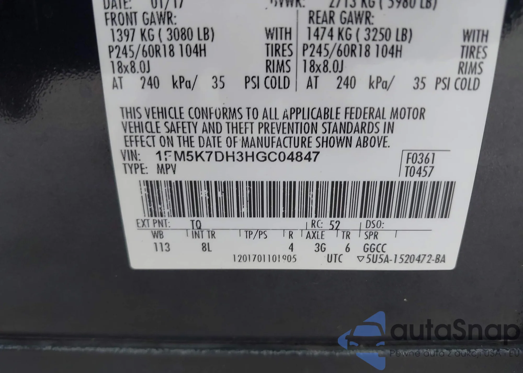 • VIN: 1FM5K7DH3HGC04847