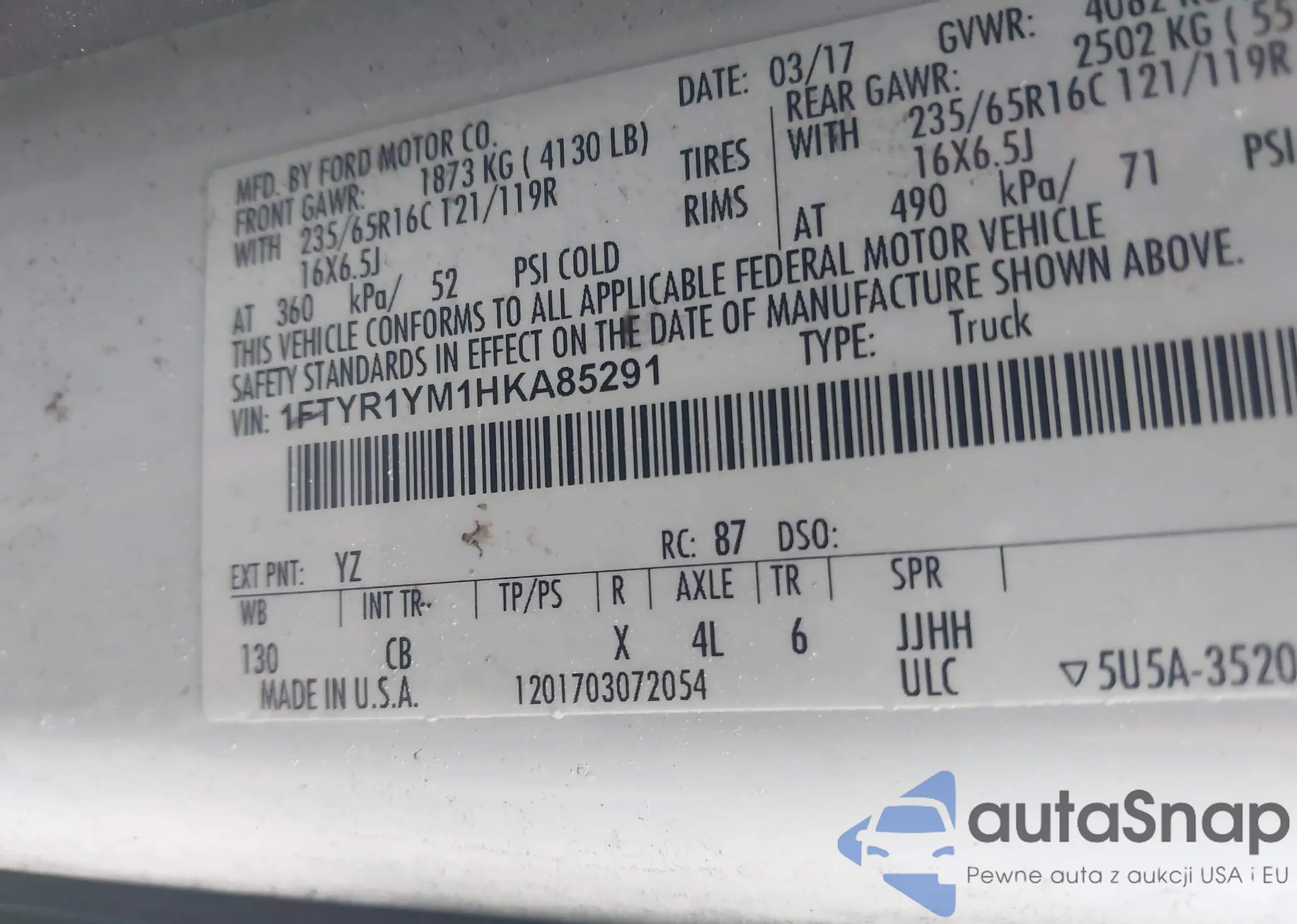 • VIN: 1FTYR1YM1HKA85291