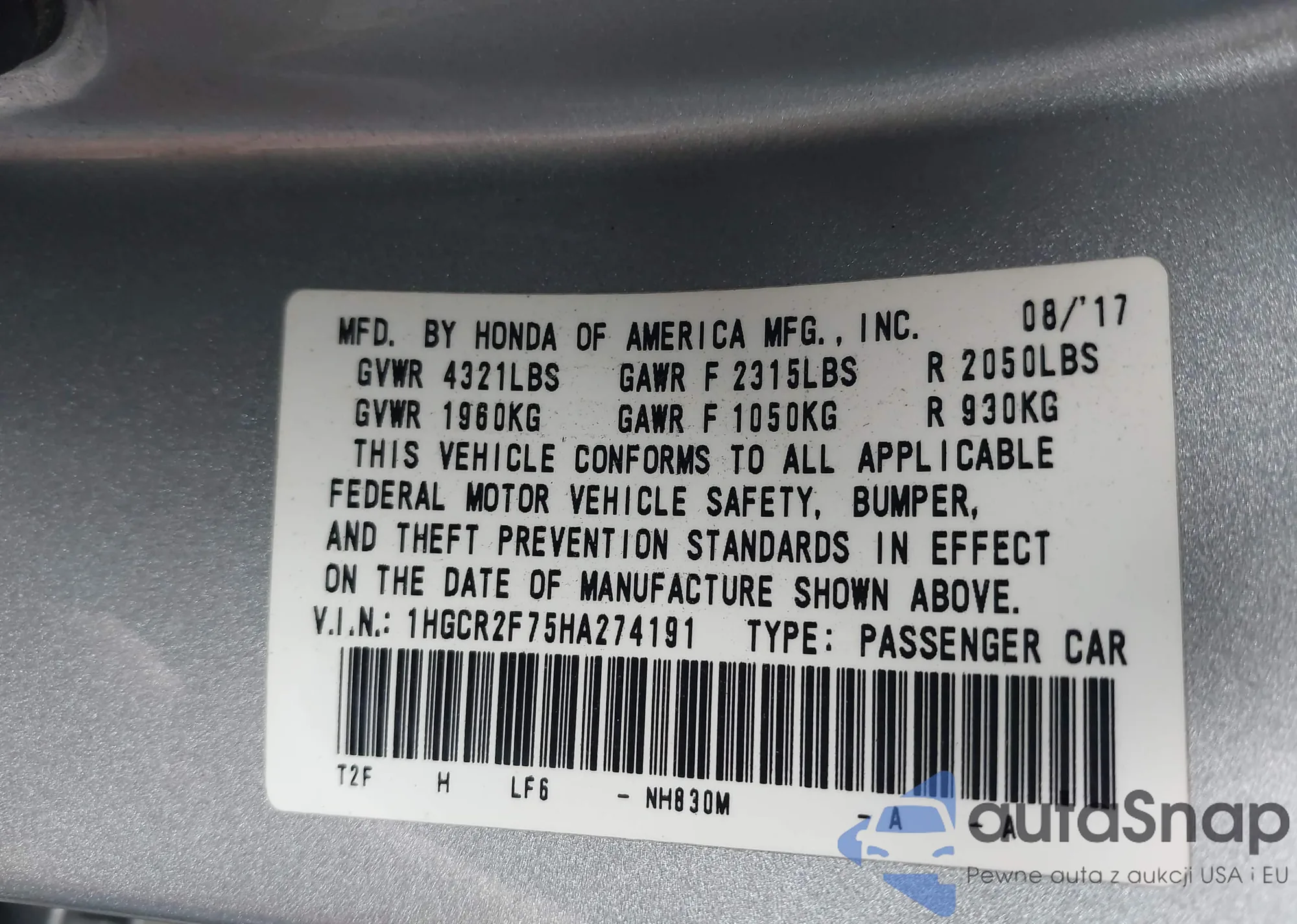 VIN: 1HGCR2F75HA274191