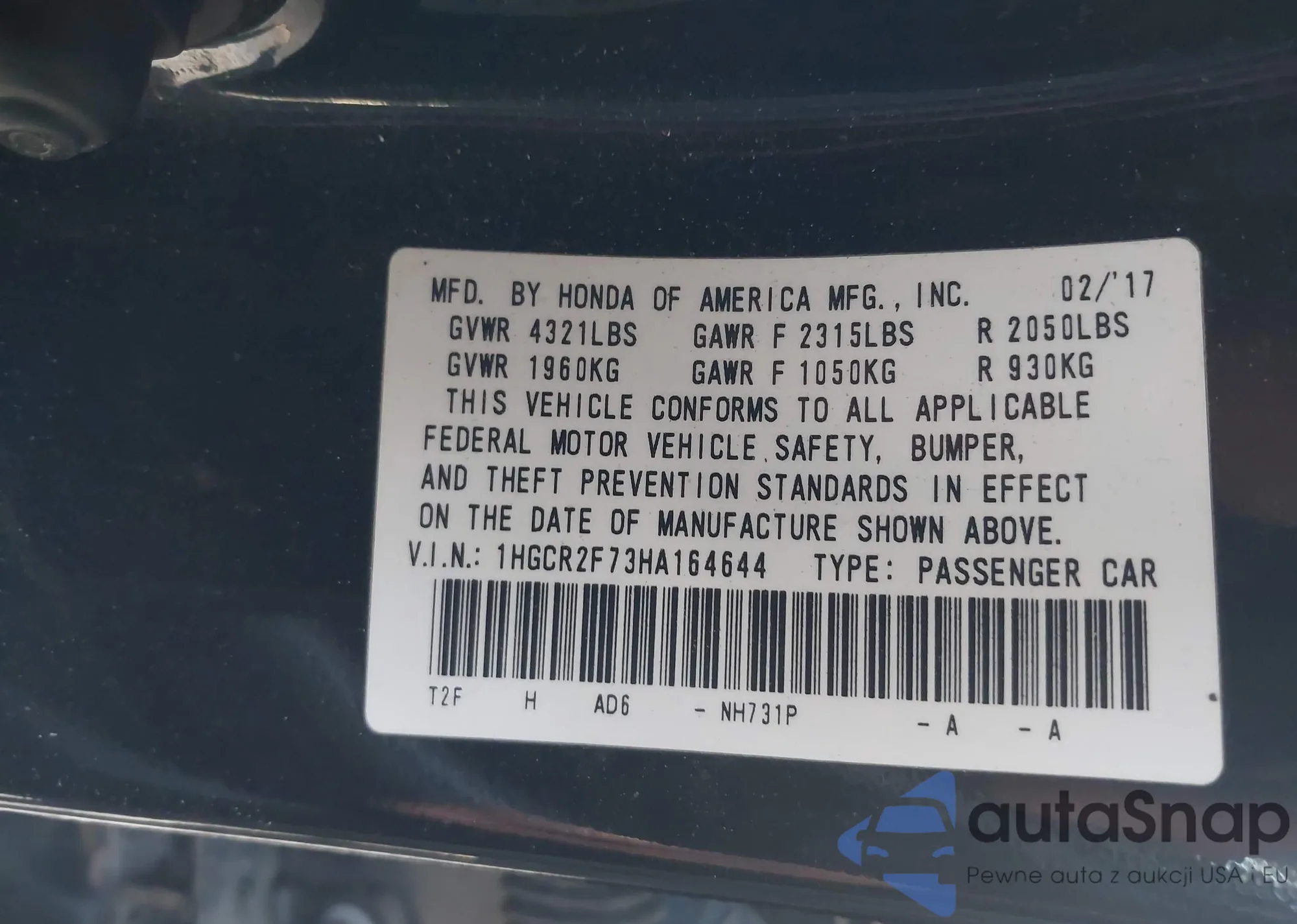 VIN: 1HGCR2F73HA164644