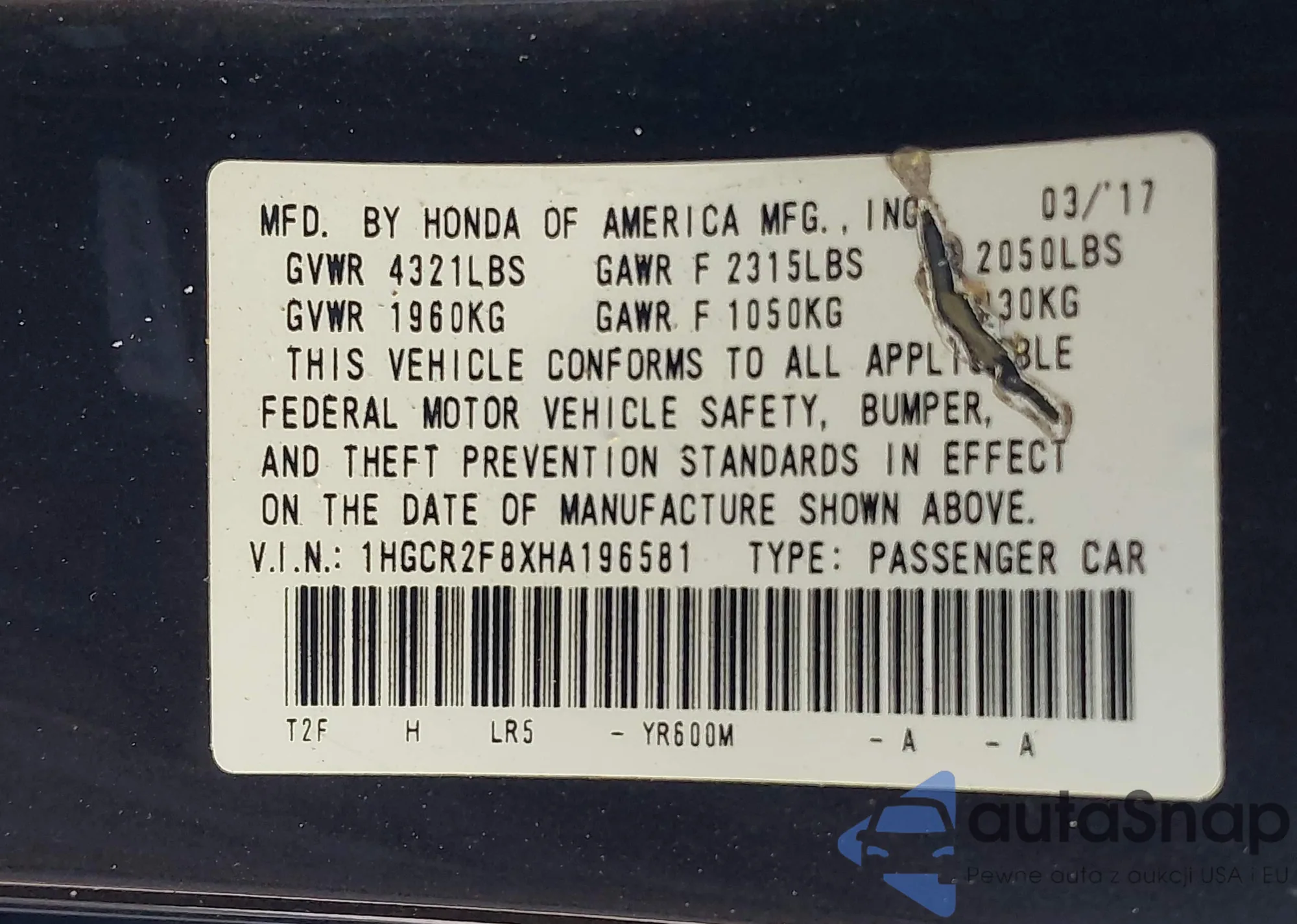 VIN: 1HGCR2F8XHA196581