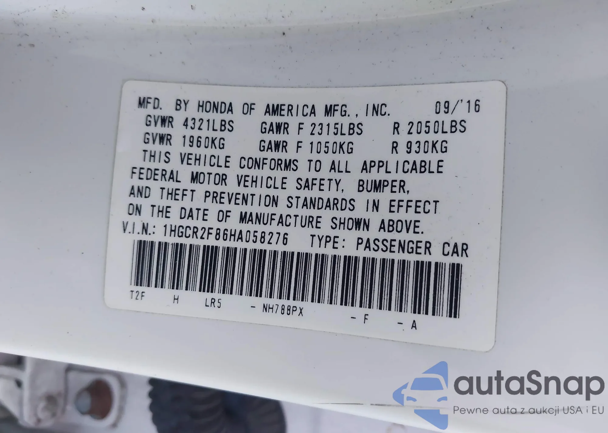 • VIN: 1HGCR2F86HA058276