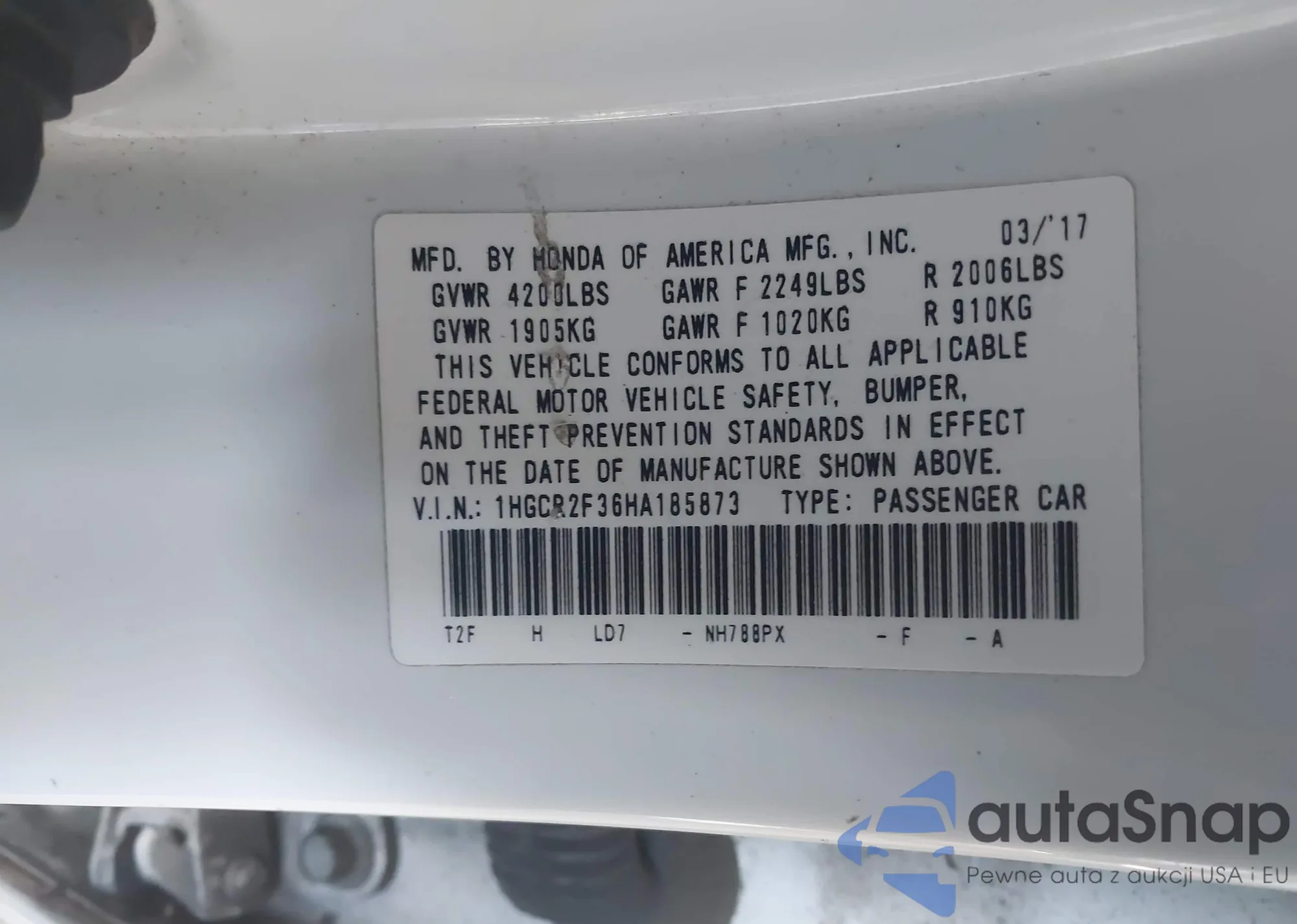 • VIN: 1HGCR2F36HA185873