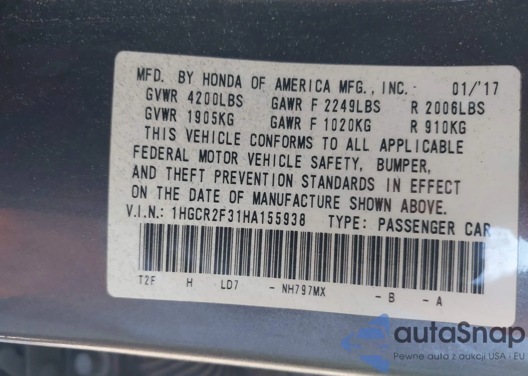 VIN: 1HGCR2F31HA155938
