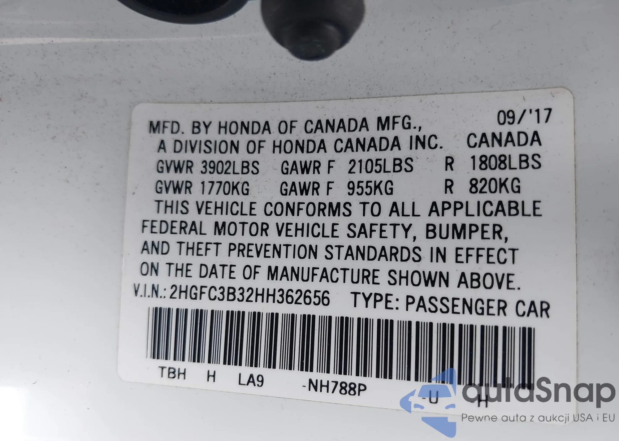 VIN: 2HGFC3B32HH362656