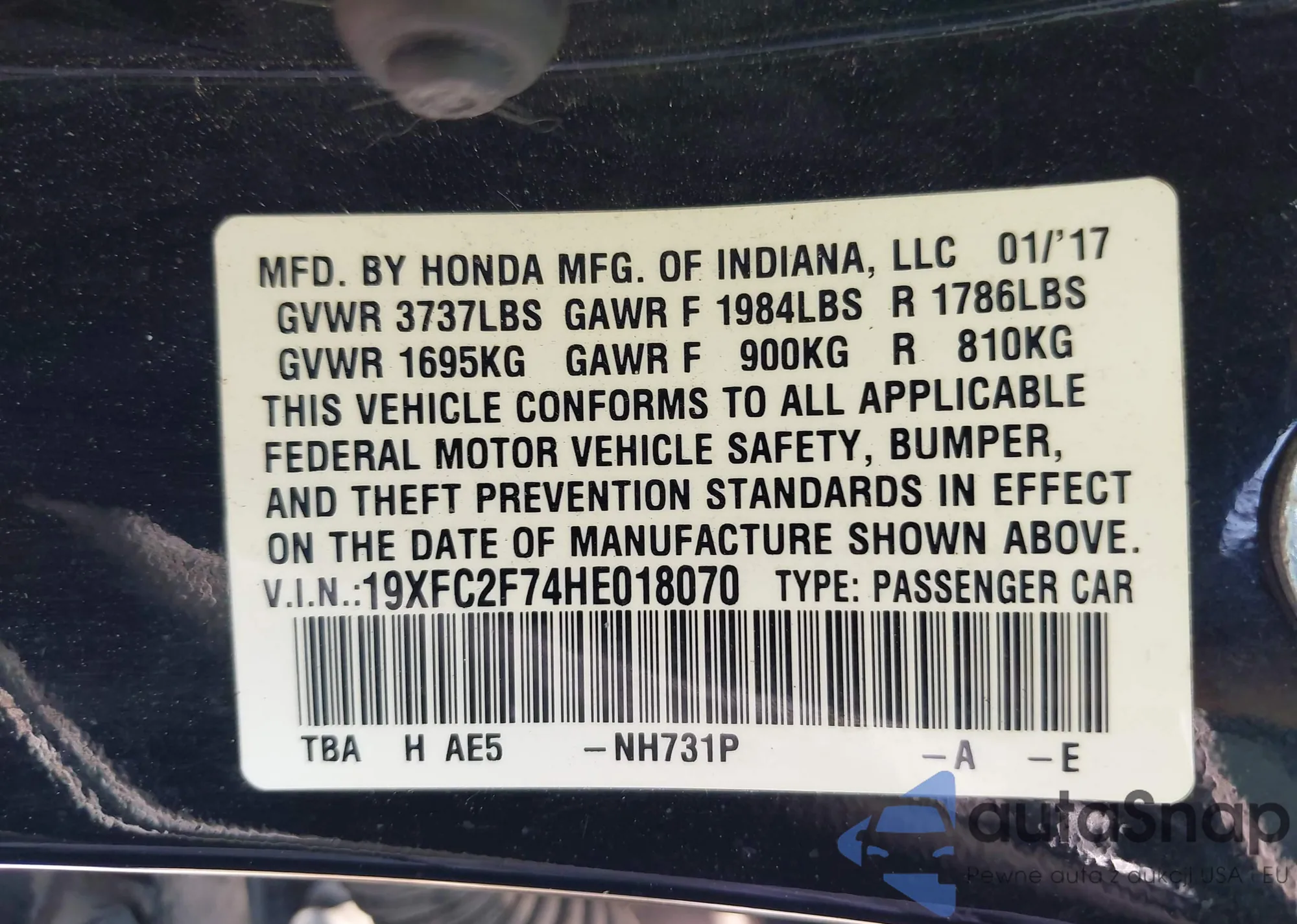 • VIN: 19XFC2F74HE018070
