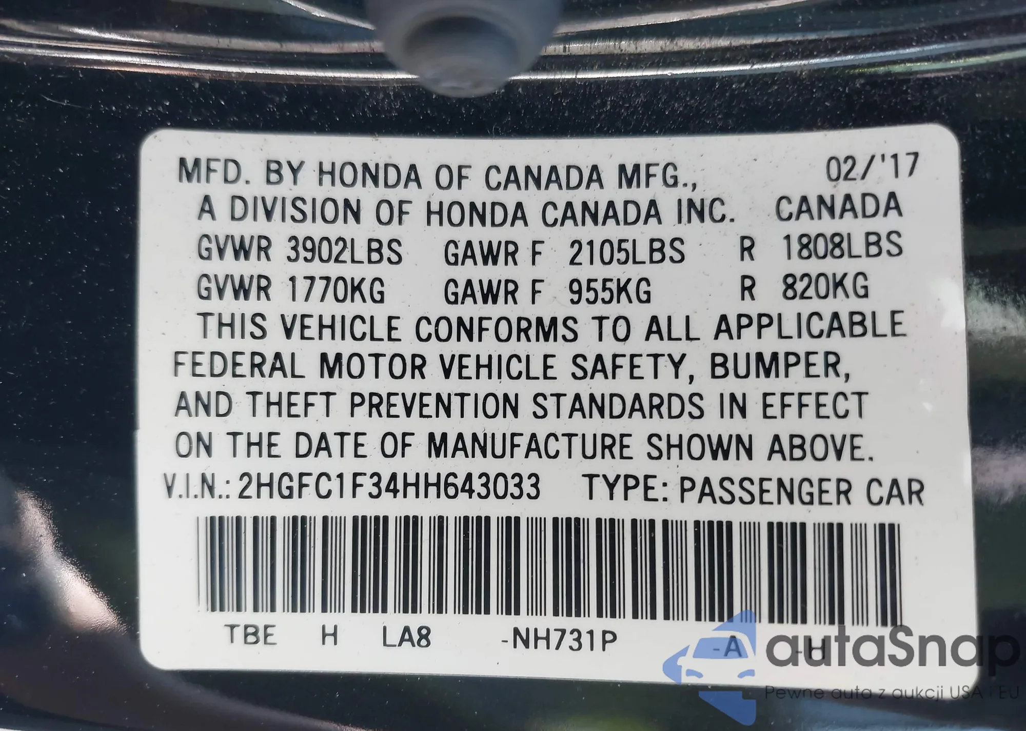 VIN: 2HGFC1F34HH643033