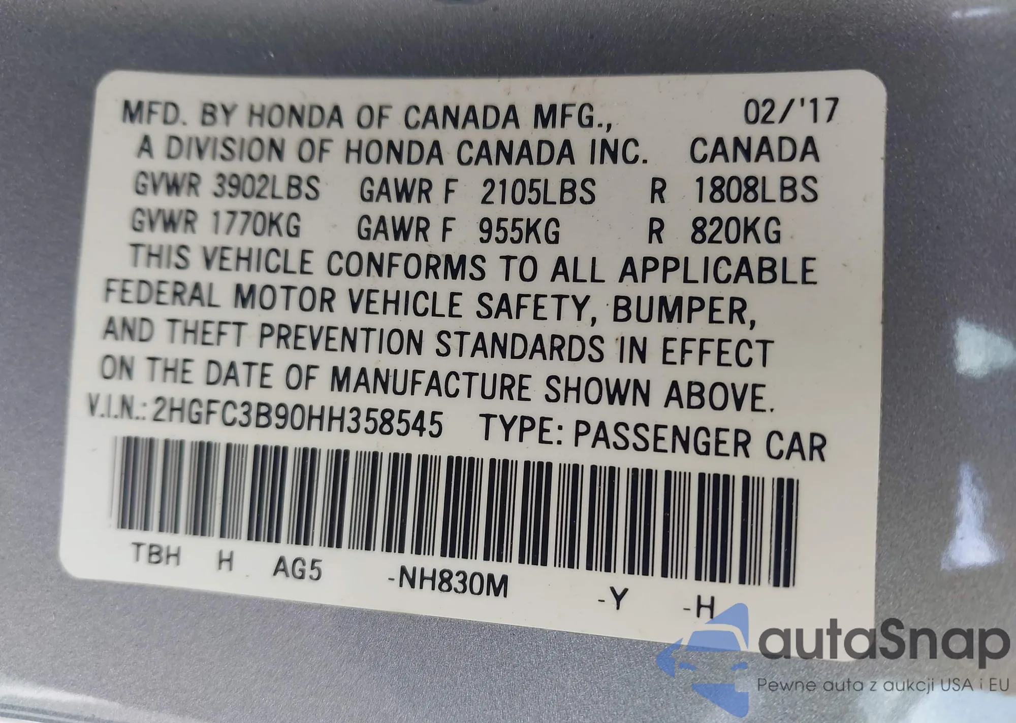 VIN: 2HGFC3B90HH358545