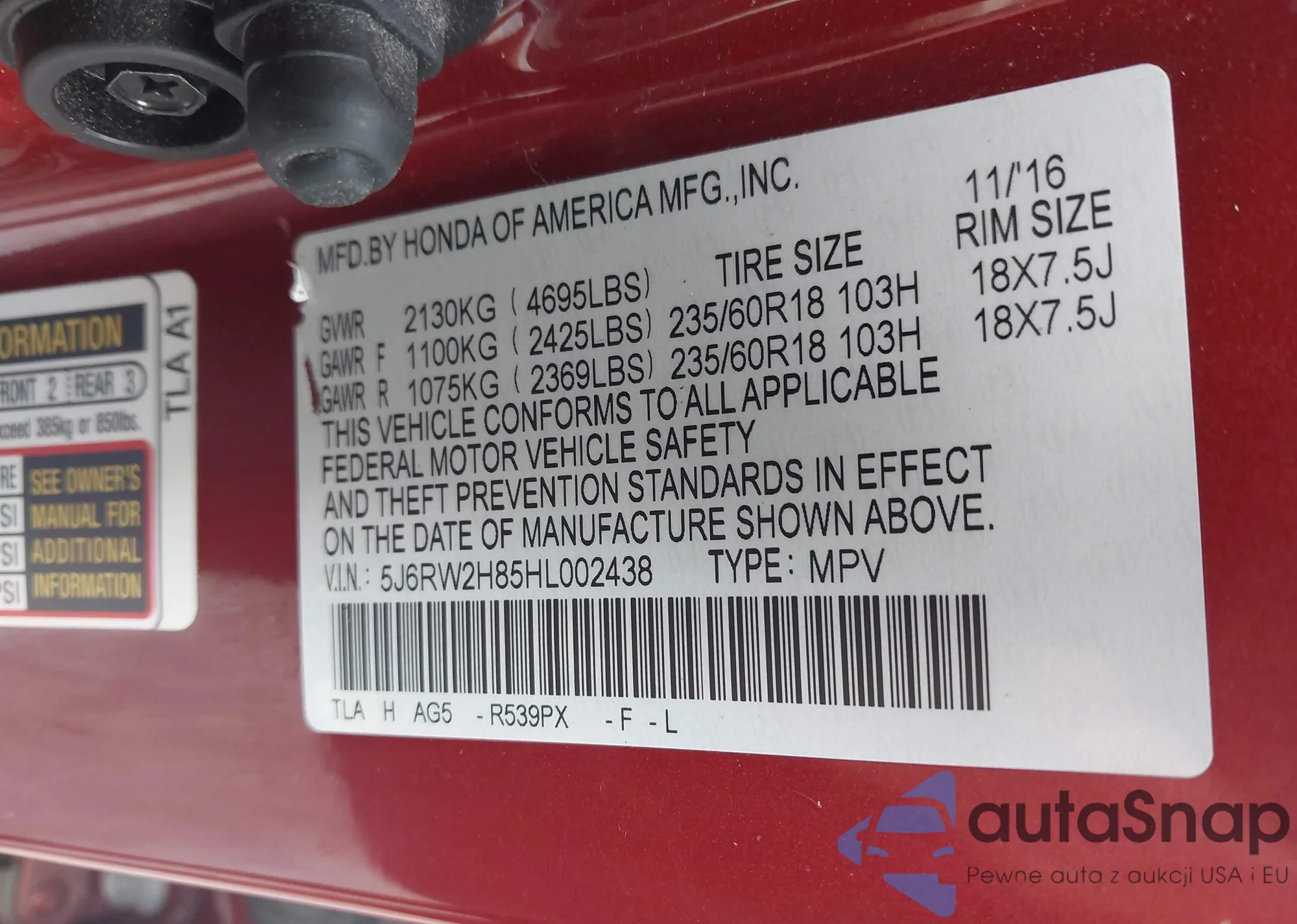VIN: 5J6RW2H85HL002438