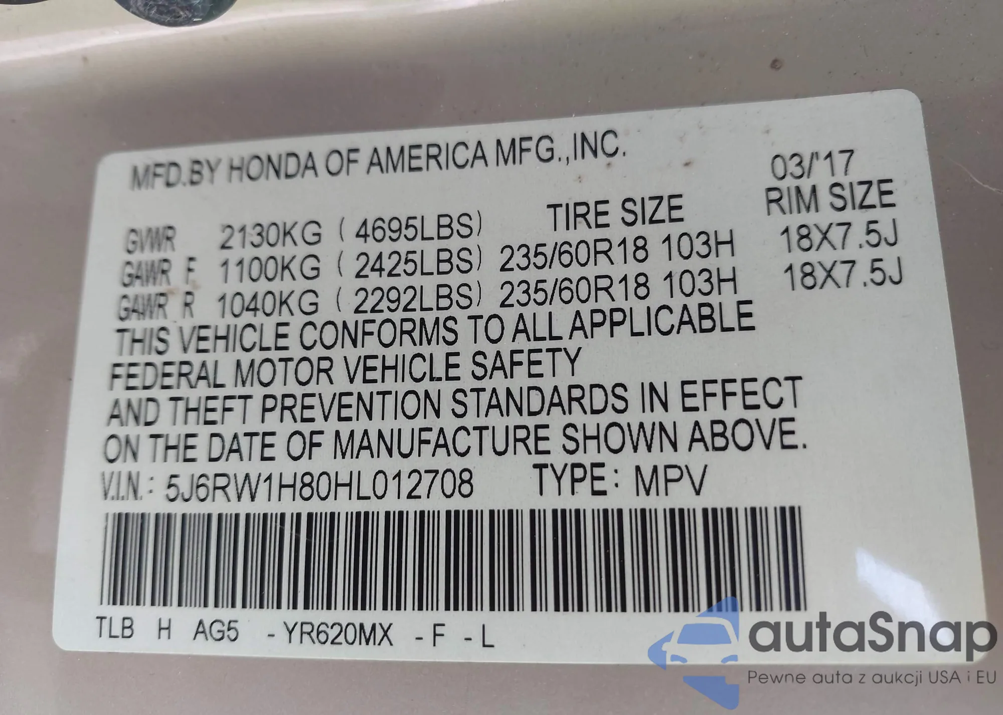 VIN: 5J6RW1H80HL012708