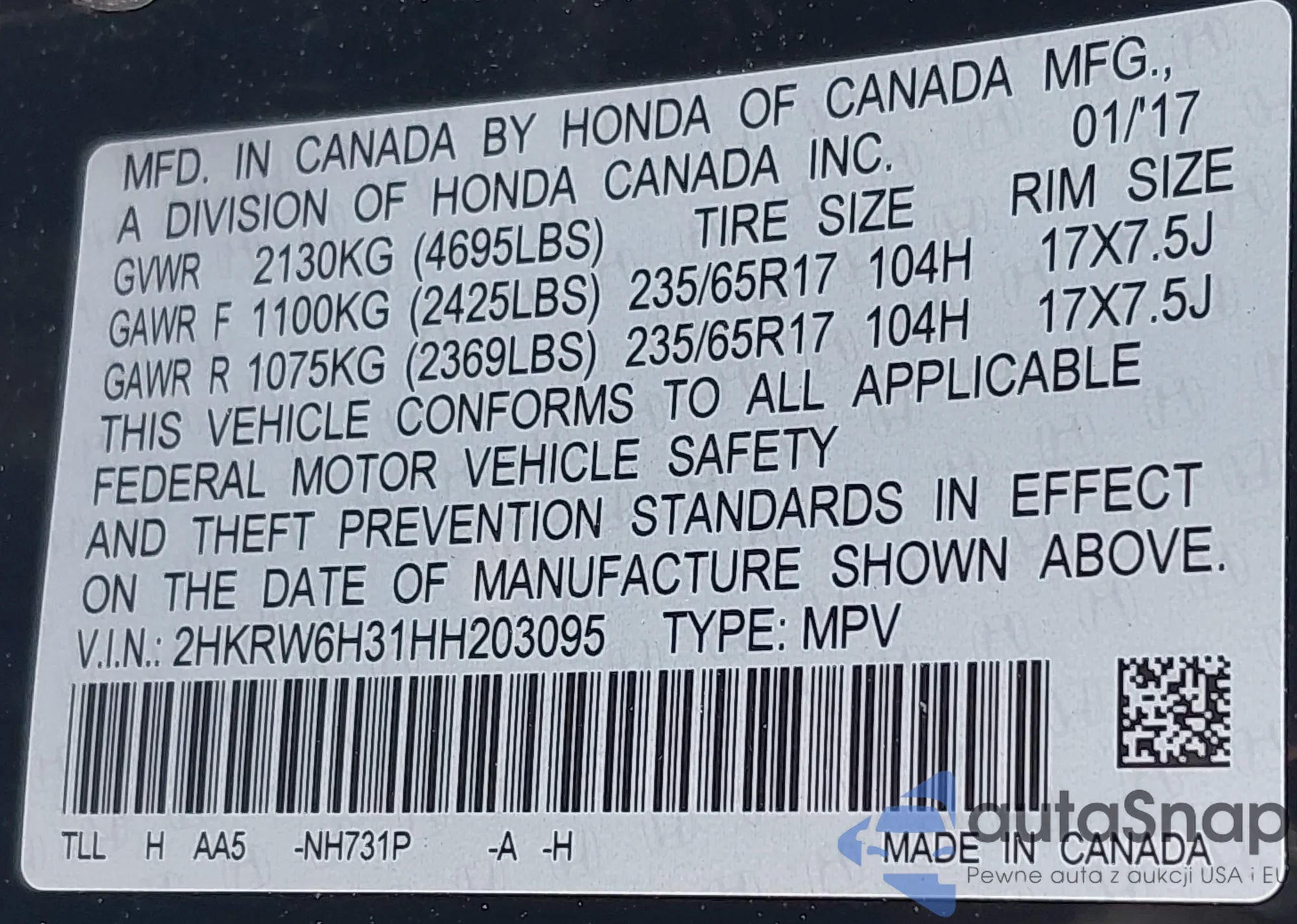 VIN: 2HKRW6H31HH203095