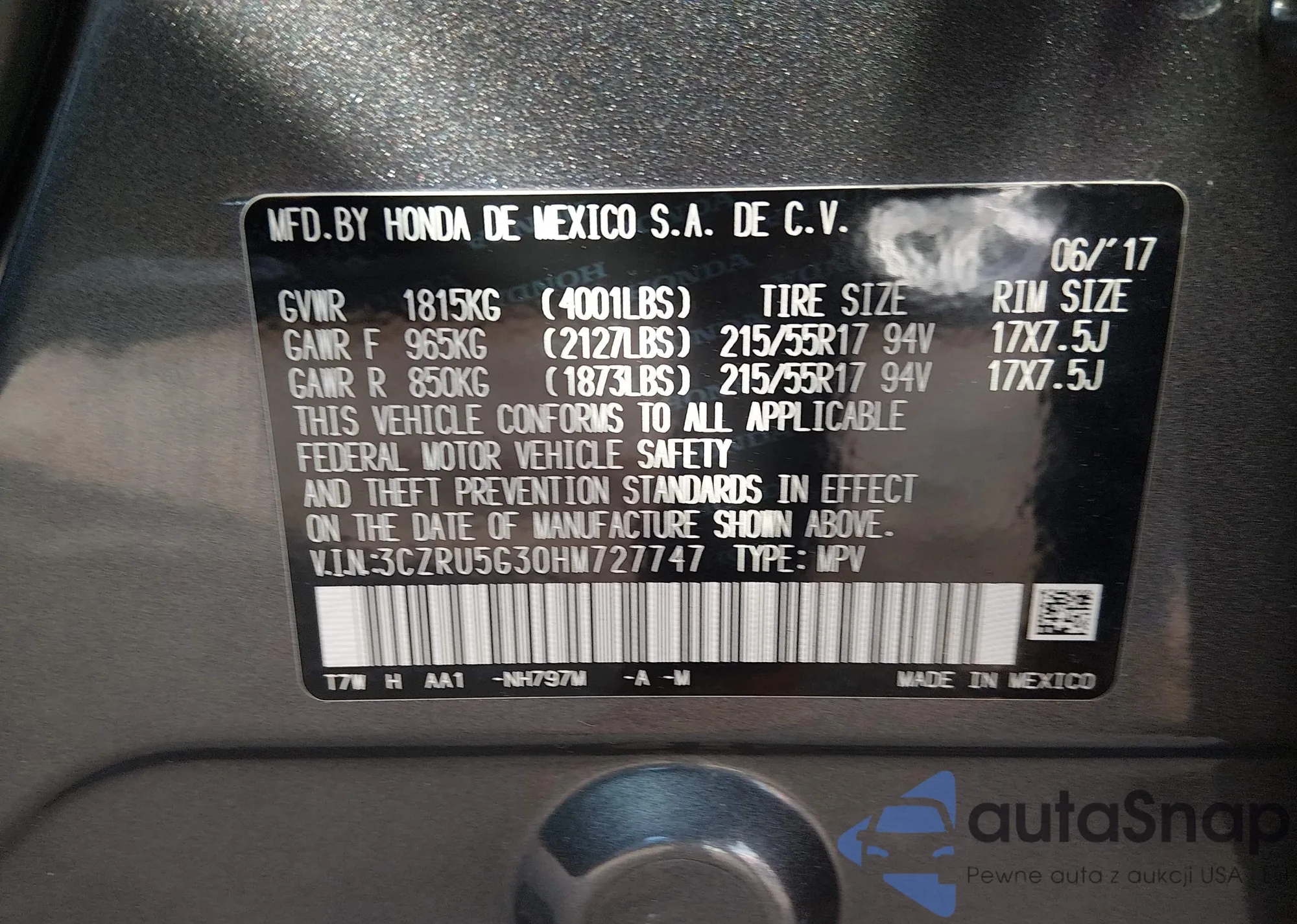 Samochód Honda HR-V 2017 (VIN 3CZRU5G30HM727747) nie był wcześniej licytowany. Dokumenty są czyste, przebieg odpowiada lub jest niższy niż średnia rynku. Sprzedaje go firma ubezpieczeniowa – polecamy zakup. Dostawa do portu zajmie ok. 6–8 tygodni.