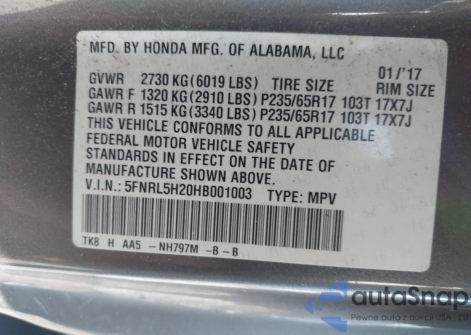 Samochód Honda Odyssey 2017 (VIN 5FNRL5H20HB001003) nie był wcześniej licytowany. Dokumenty są czyste, przebieg odpowiada lub jest niższy niż średnia rynku. Sprzedaje go firma ubezpieczeniowa – polecamy zakup. Dostawa do portu zajmie ok. 6–8 tygodni.