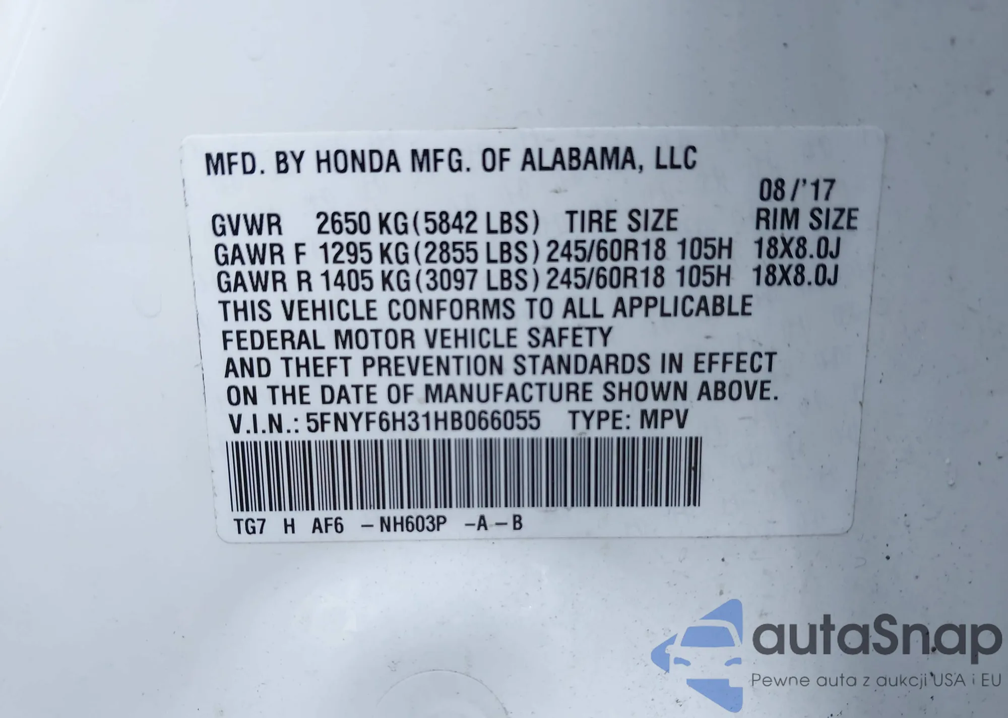 VIN: 5FNYF6H31HB066055