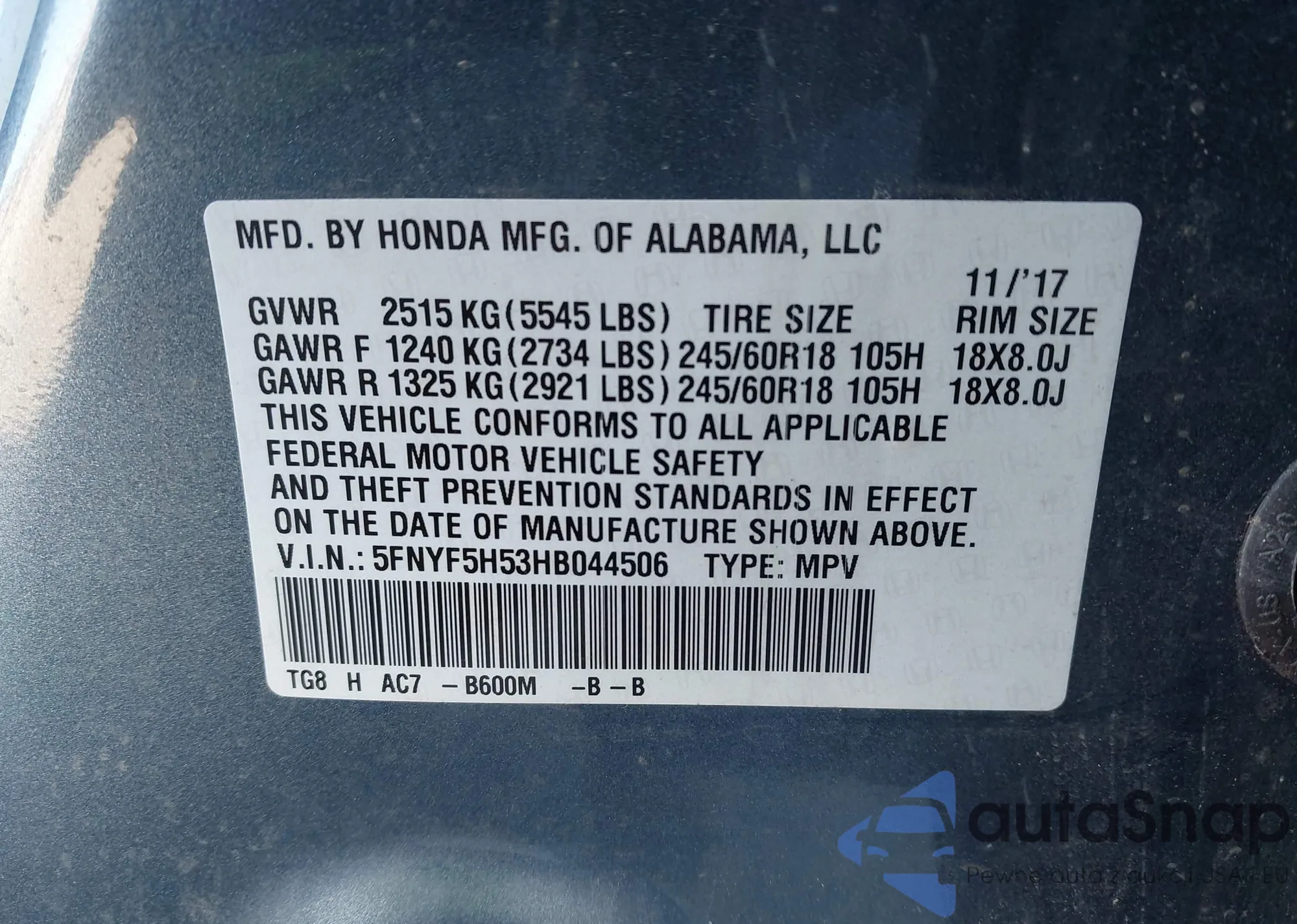 VIN: 5FNYF5H53HB044506