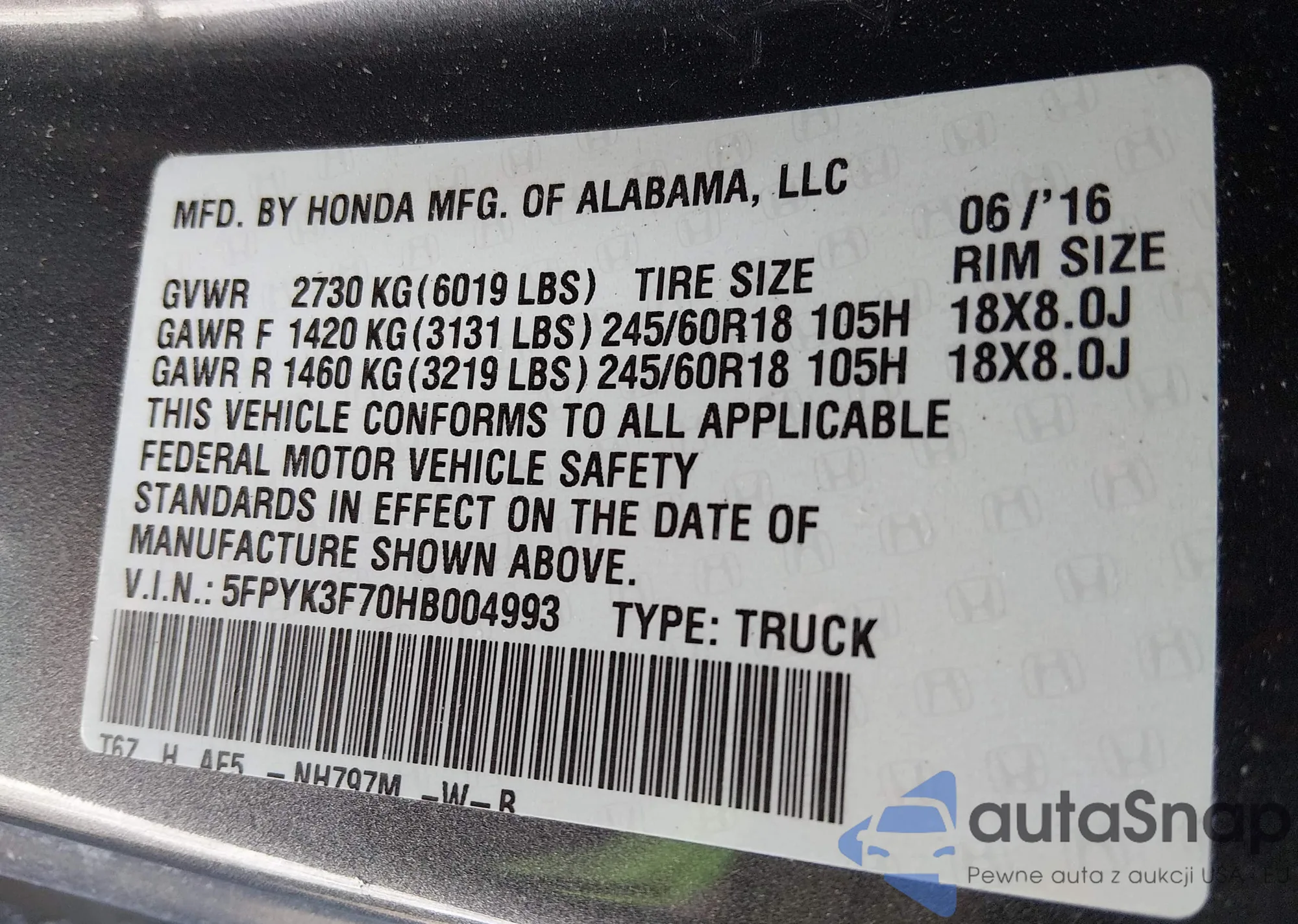 • VIN: 5FPYK3F70HB004993