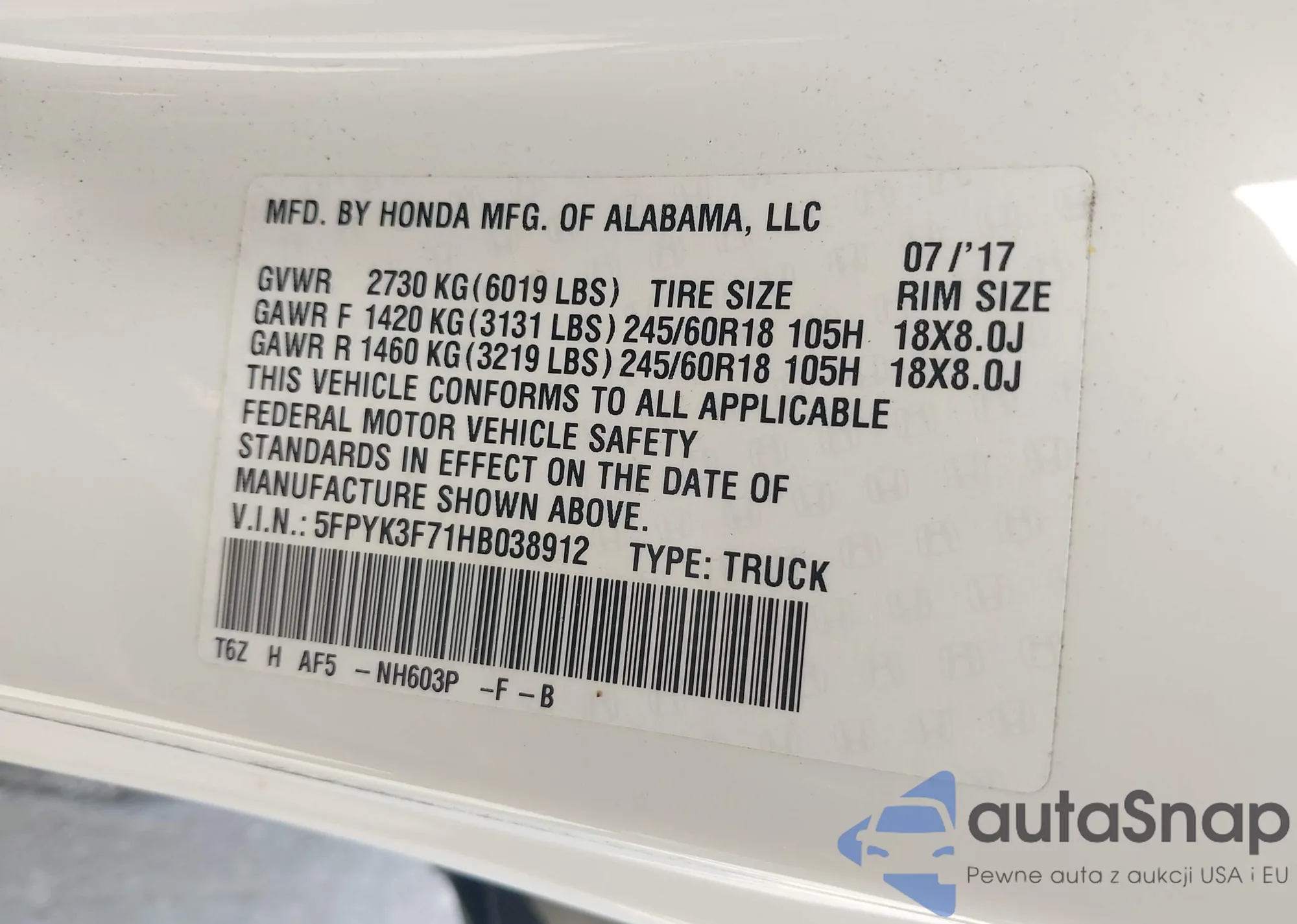 • VIN: 5FPYK3F71HB038912