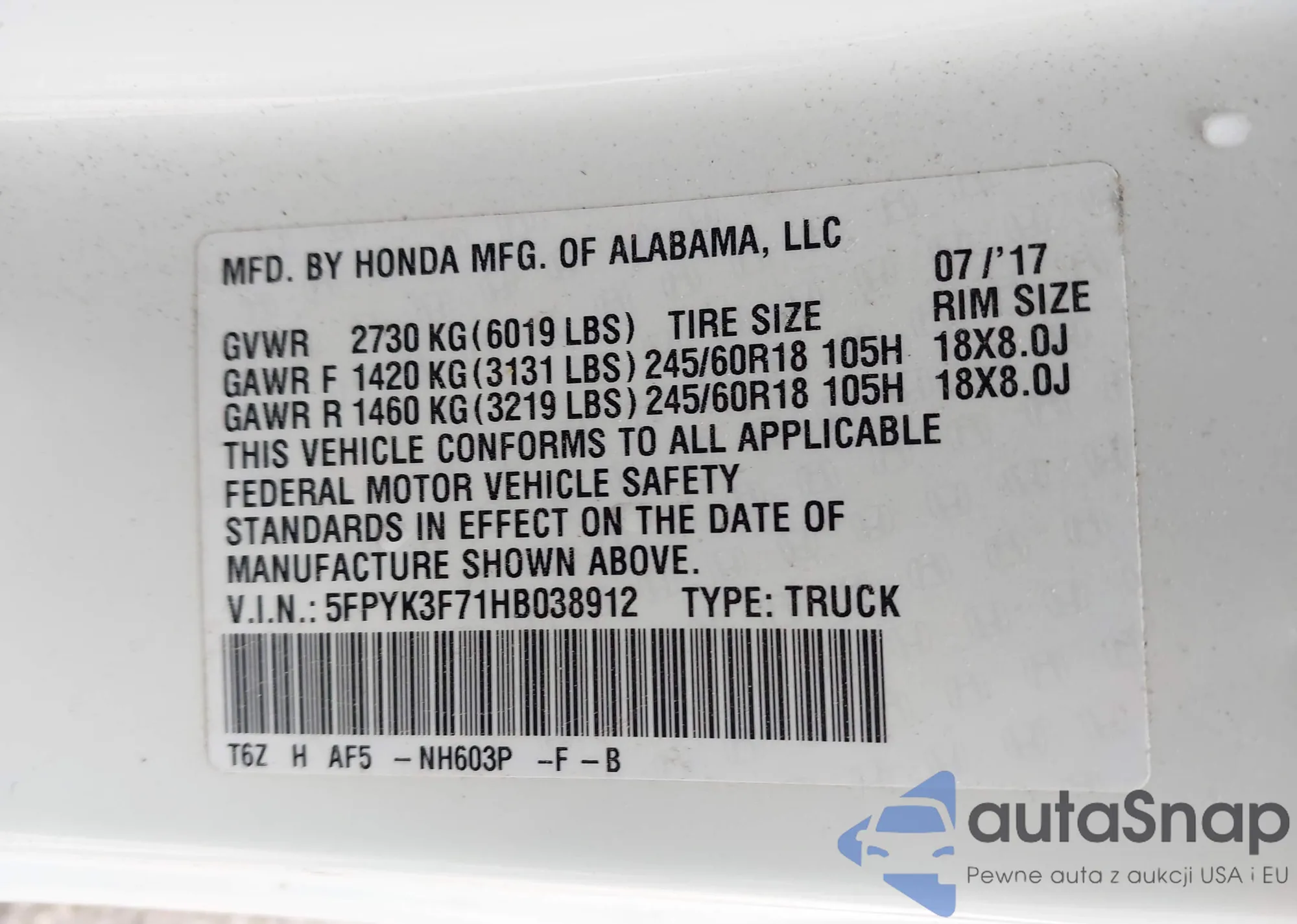 Samochód Honda Ridgeline 2017 (VIN 5FPYK3F71HB038912) był już licytowany 1 razy i/lub sprzedaje go niezweryfikowany sprzedawca. Zalecamy raport Carfax i potwierdzenie możliwości rejestracji pojazdu przed zakupem.
