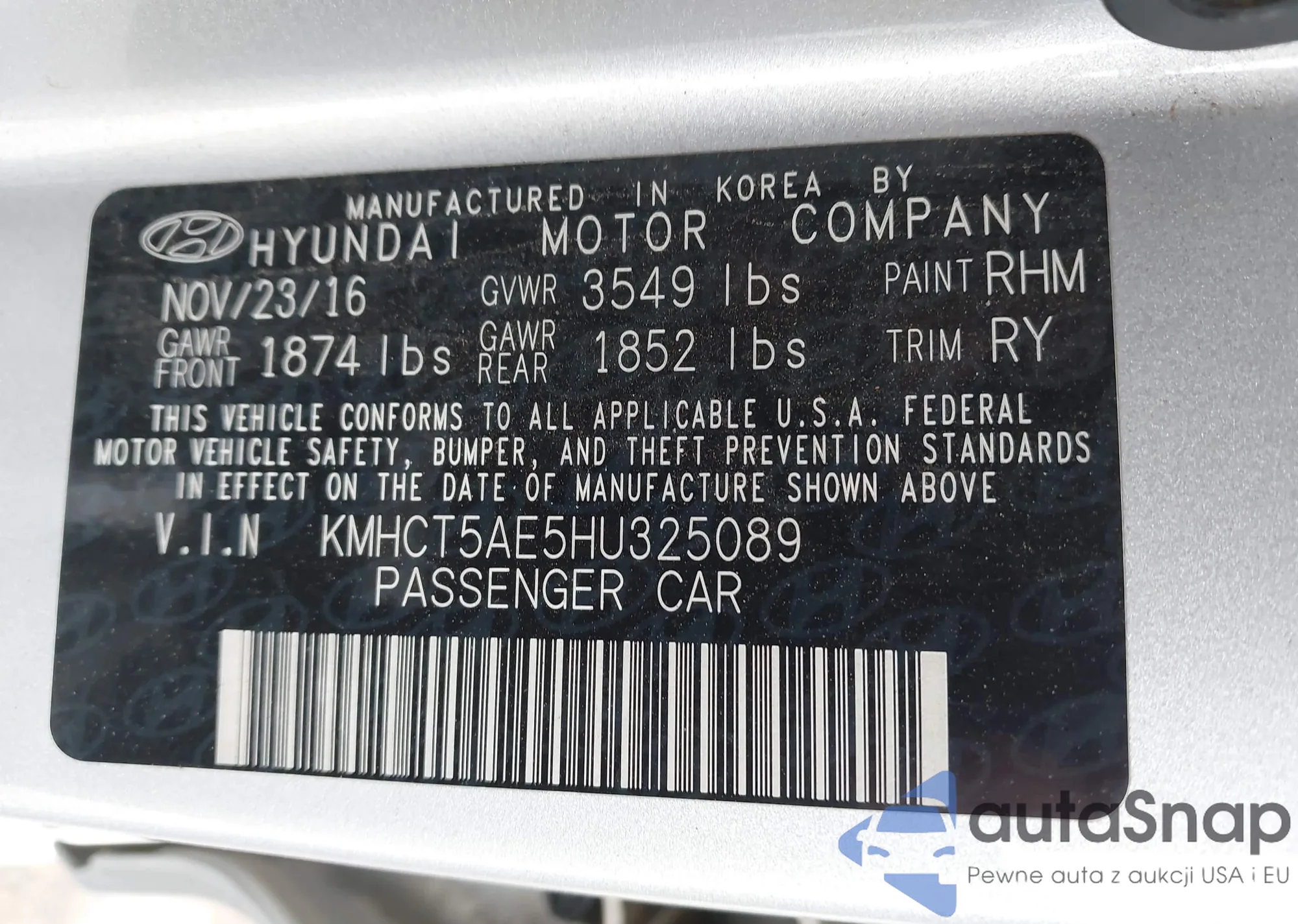 Samochód Hyundai Accent 2017 (VIN KMHCT5AE5HU325089) nie był wcześniej licytowany. Dokumenty są czyste, przebieg odpowiada lub jest niższy niż średnia rynku. Sprzedaje go firma ubezpieczeniowa – polecamy zakup. Dostawa do portu zajmie ok. 6–8 tygodni.