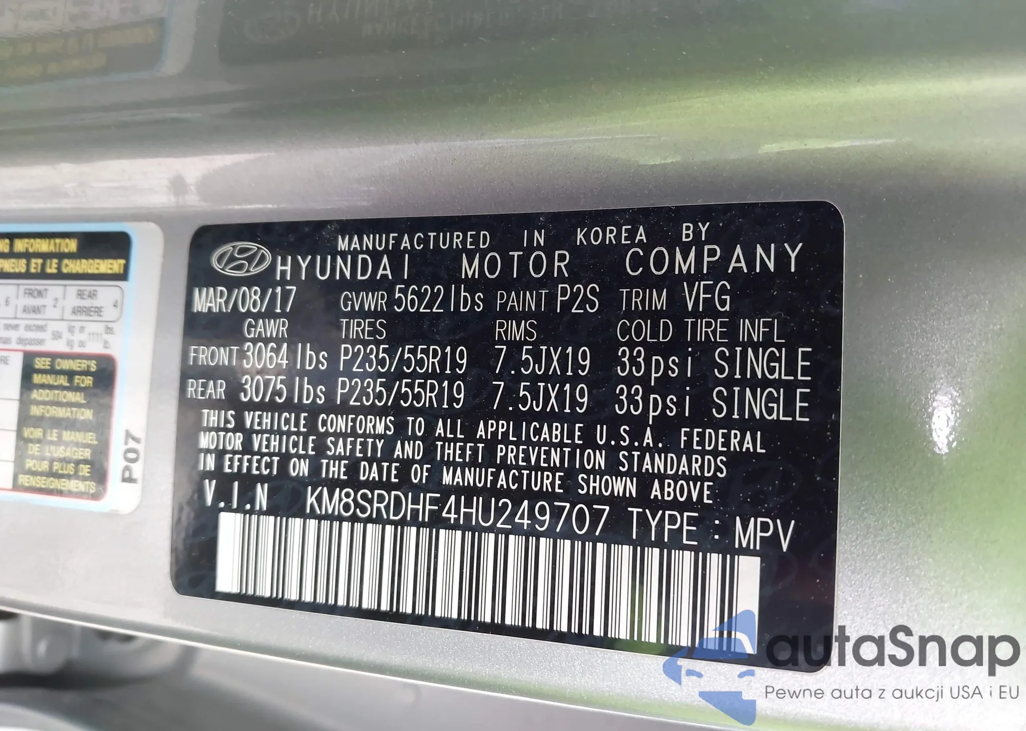 Samochód Hyundai Santa Fe 2017 (VIN KM8SRDHF4HU249707) nie był wcześniej licytowany. Dokumenty są czyste, przebieg odpowiada lub jest niższy niż średnia rynku. Sprzedaje go firma ubezpieczeniowa – polecamy zakup. Dostawa do portu zajmie ok. 6–8 tygodni.