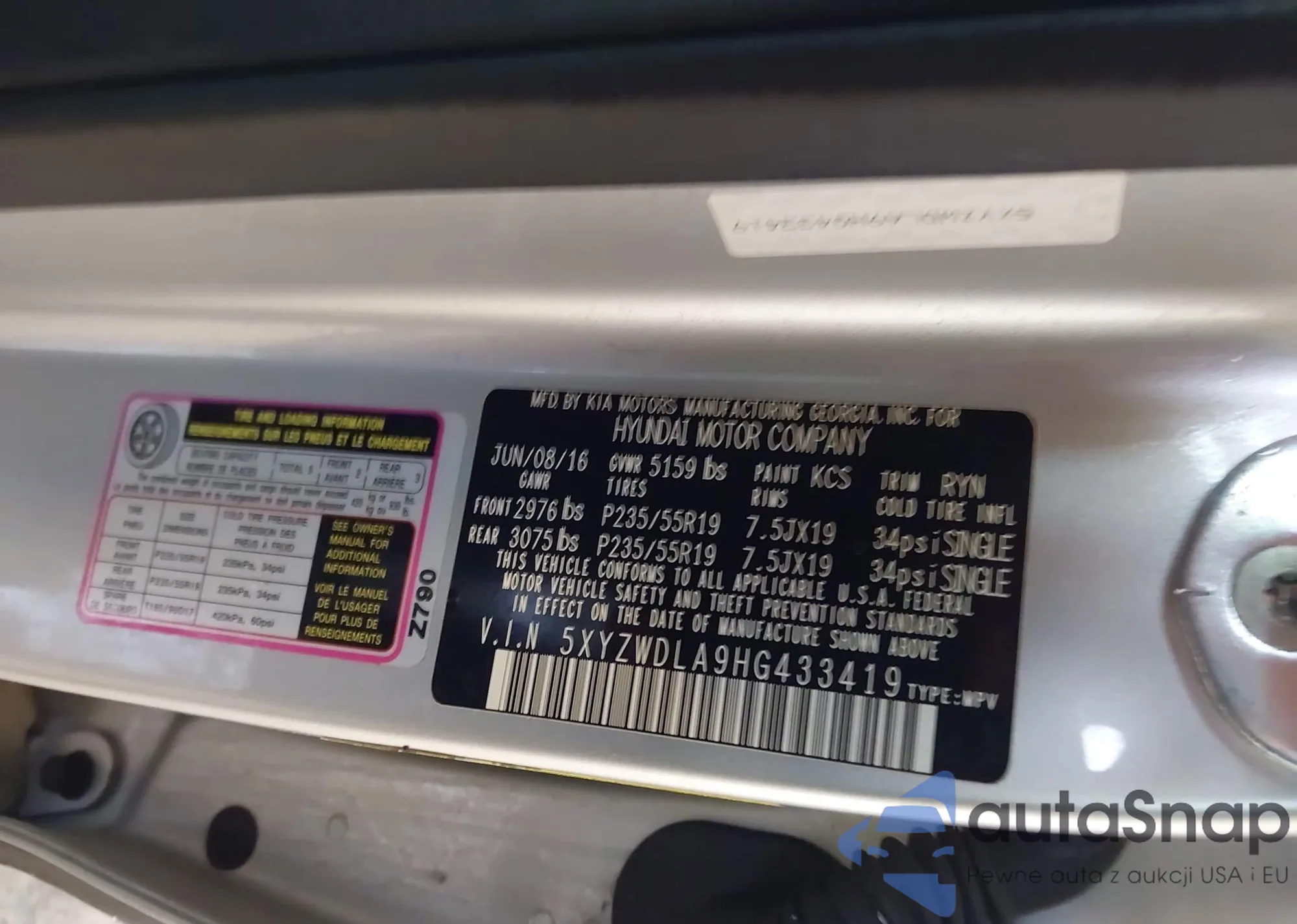 Samochód Hyundai Santa Fe 2017 (VIN 5XYZWDLA9HG433419) ma dokumenty uniemożliwiające rejestrację. Mogą pojawić się trudności przy eksporcie i rejestracji. Skontaktuj się z ekspertami AutaSnap w celu znalezienia alternatywy.