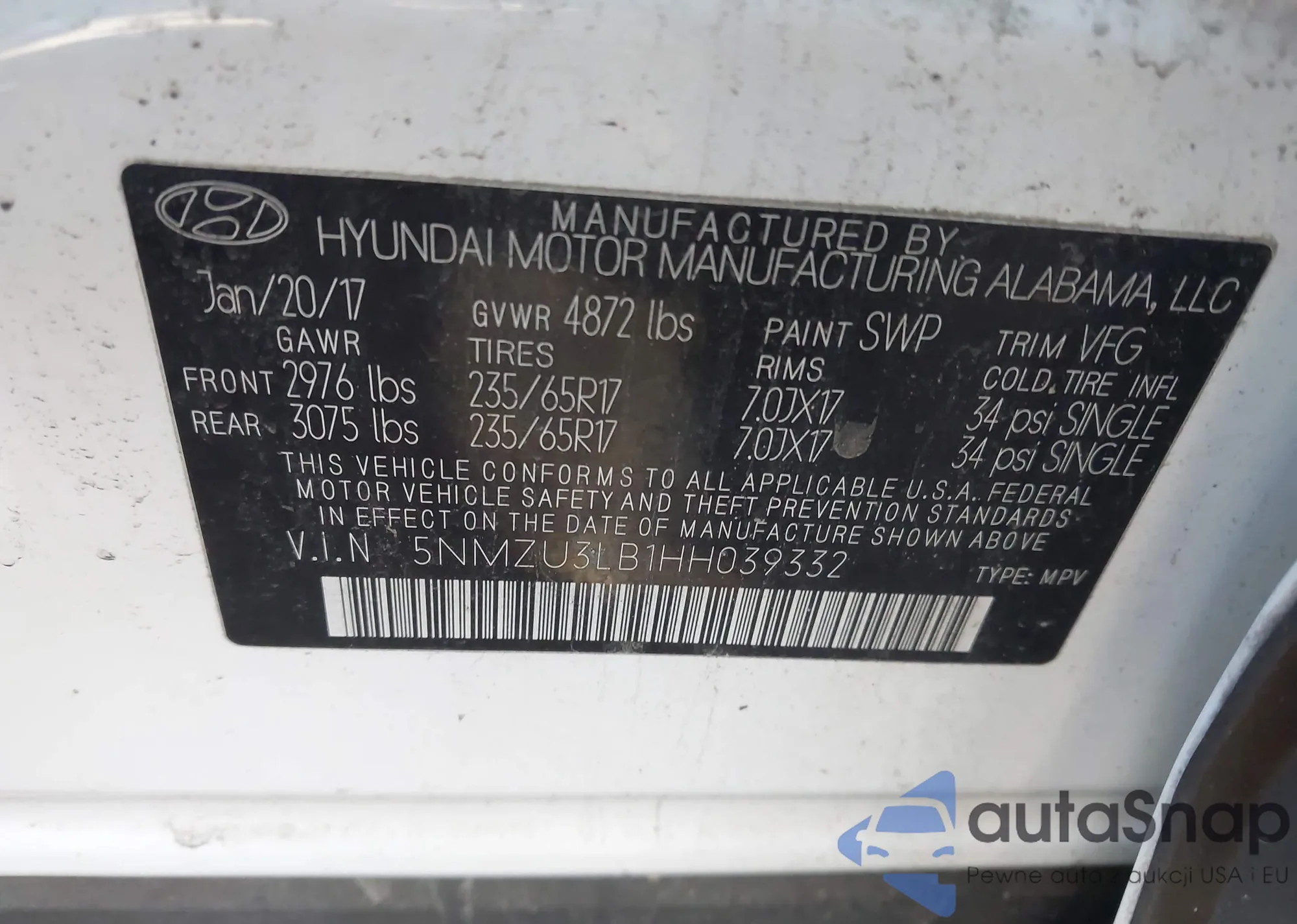 • VIN: 5NMZU3LB1HH039332