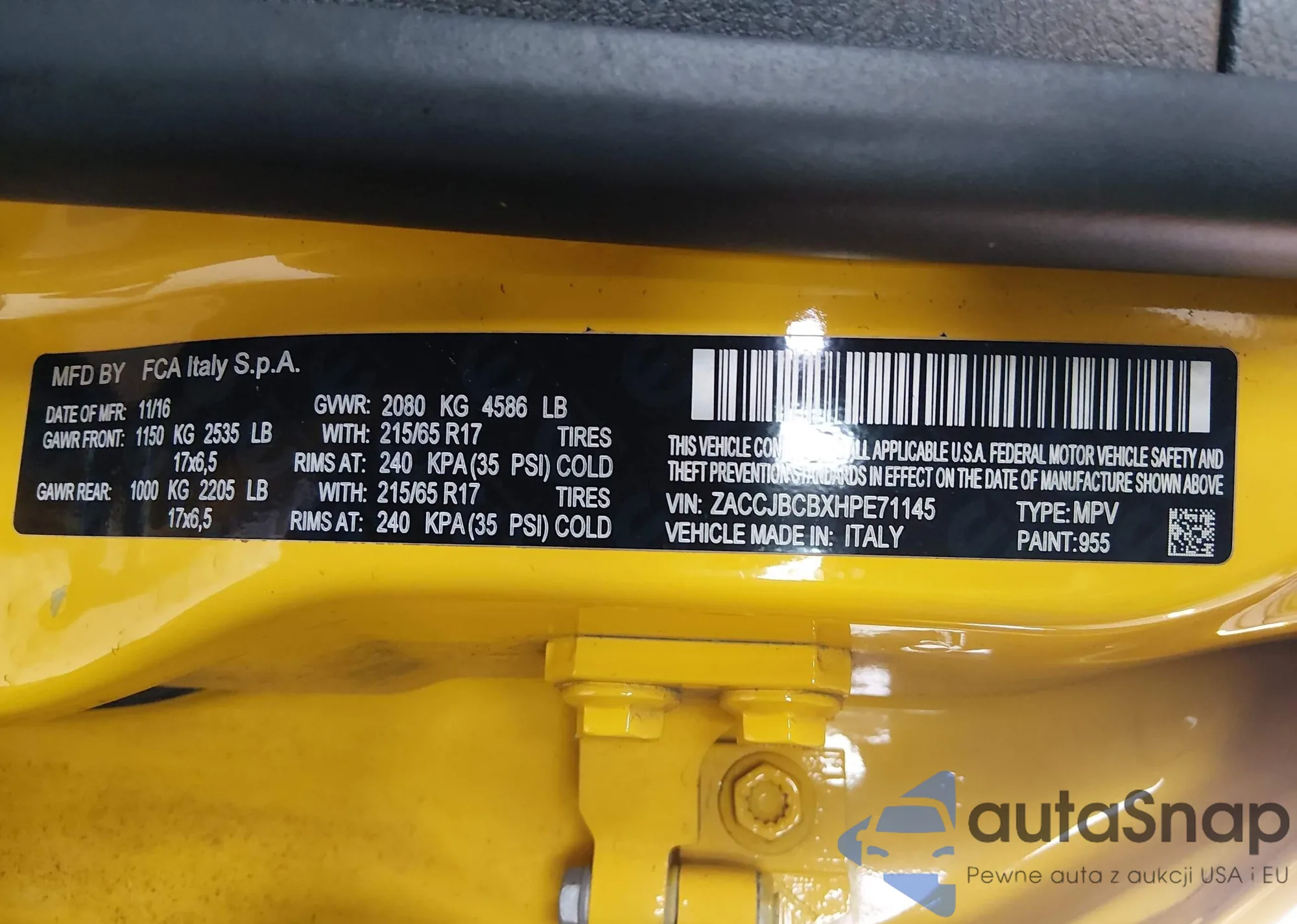 Samochód Jeep Renegade 2017 (VIN ZACCJBCBXHPE71145) ma dokumenty uniemożliwiające rejestrację. Mogą pojawić się trudności przy eksporcie i rejestracji. Skontaktuj się z ekspertami AutaSnap w celu znalezienia alternatywy.