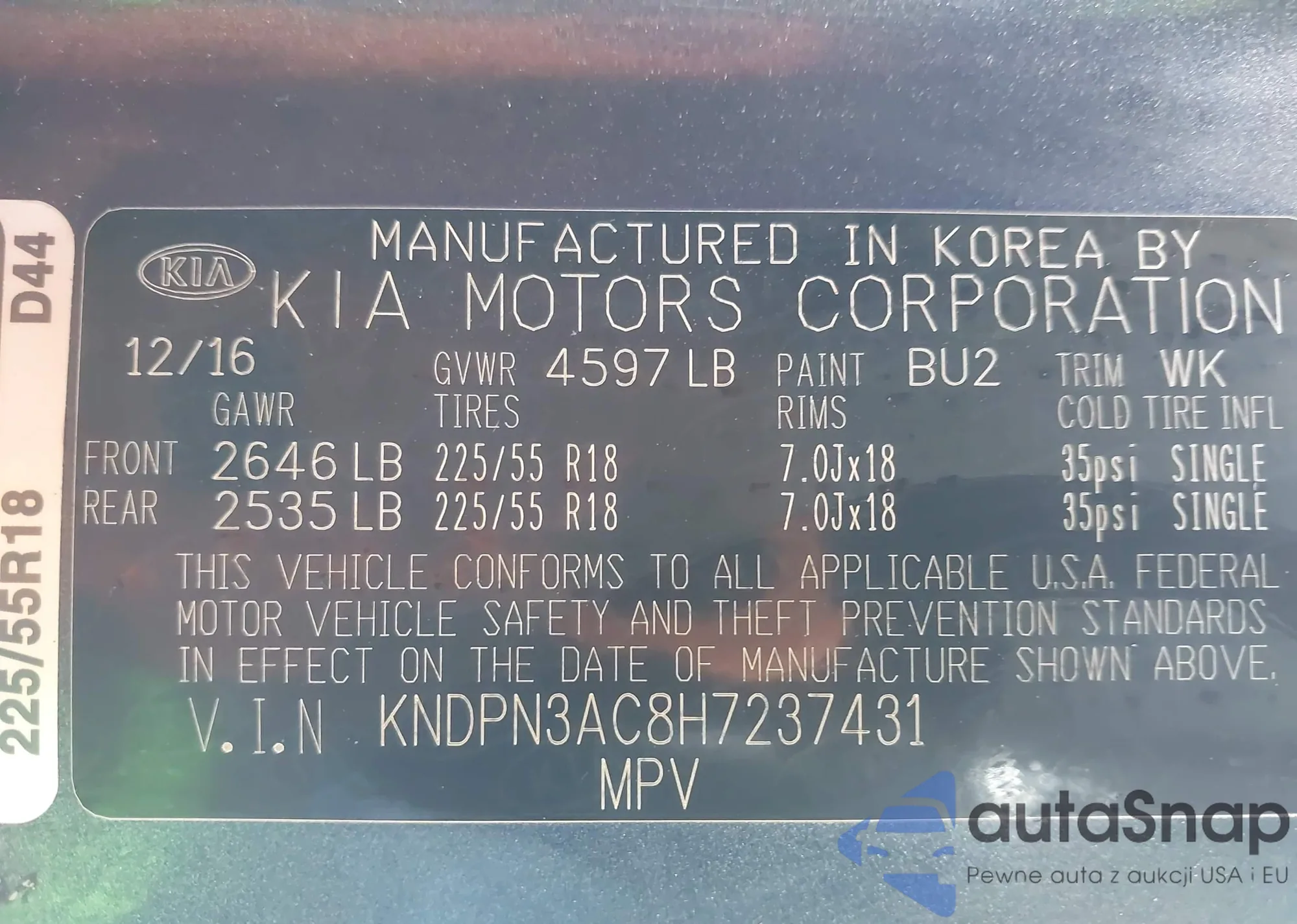 Samochód Kia Sportage 2017 (VIN KNDPN3AC8H7237431) nie był wcześniej licytowany. Dokumenty są czyste, przebieg odpowiada lub jest niższy niż średnia rynku. Sprzedaje go firma ubezpieczeniowa – polecamy zakup. Dostawa do portu zajmie ok. 6–8 tygodni.