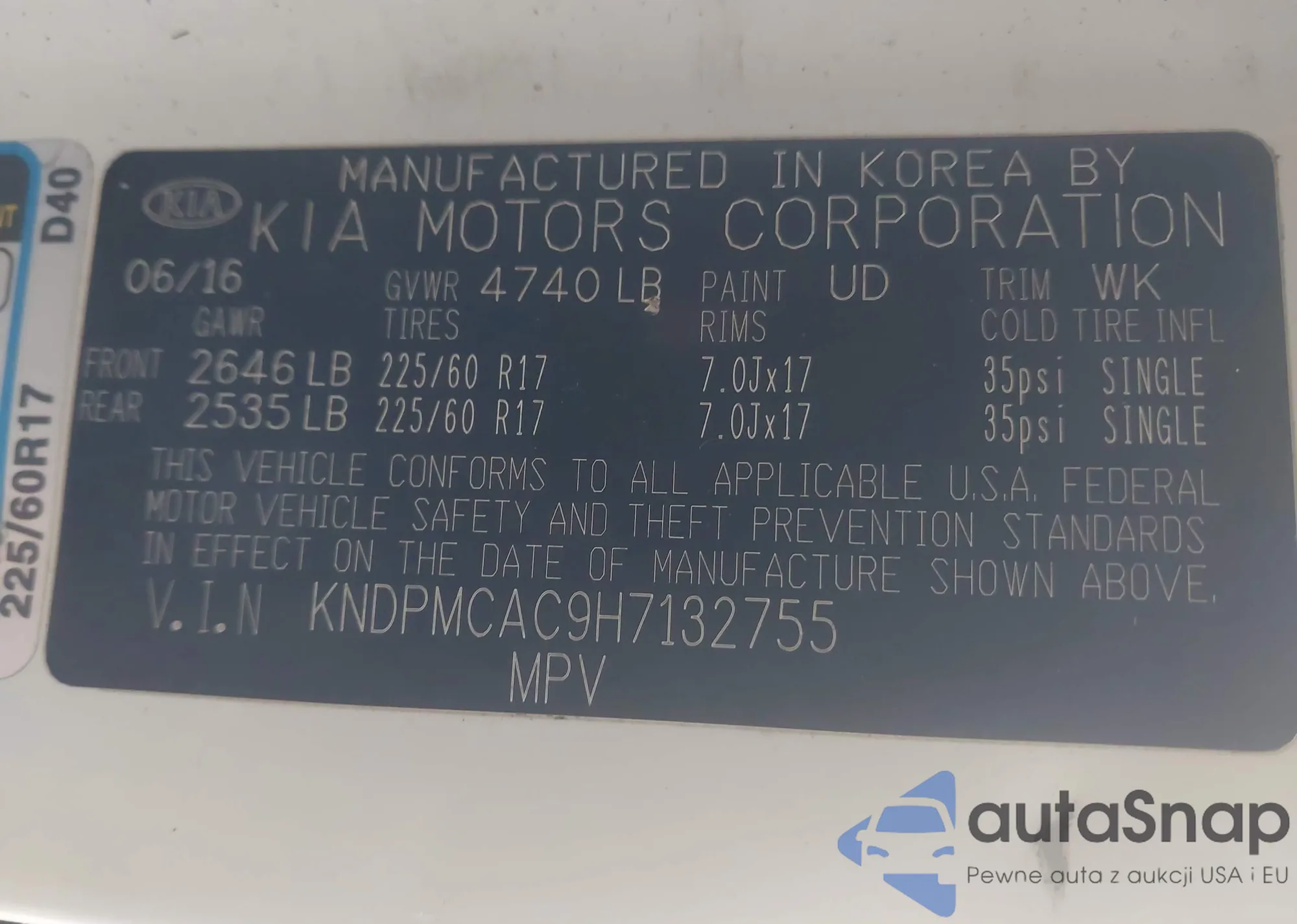 Samochód Kia Sportage 2017 (VIN KNDPMCAC9H7132755) nie był wcześniej licytowany. Dokumenty są czyste, przebieg odpowiada lub jest niższy niż średnia rynku. Sprzedaje go firma ubezpieczeniowa – polecamy zakup. Dostawa do portu zajmie ok. 6–8 tygodni.