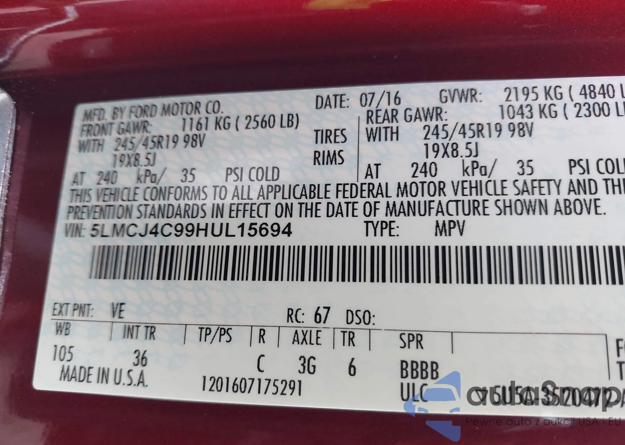 • VIN: 5LMCJ4C99HUL15694
