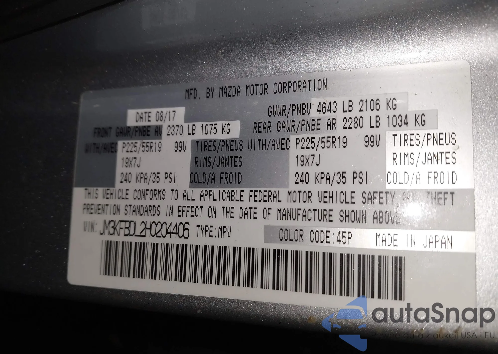 Samochód Mazda CX-5 2017 (VIN JM3KFBDL2H0204406) nie był wcześniej licytowany. Dokumenty są czyste, przebieg odpowiada lub jest niższy niż średnia rynku. Sprzedaje go firma ubezpieczeniowa – polecamy zakup. Dostawa do portu zajmie ok. 6–8 tygodni.