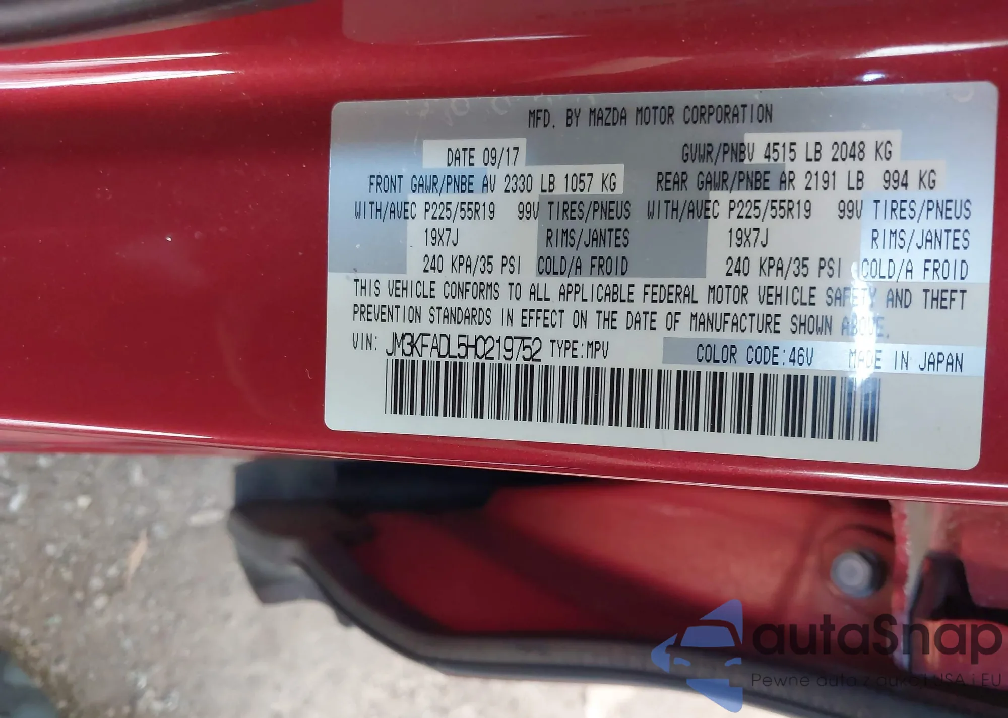 Samochód Mazda CX-5 2017 (VIN JM3KFADL5H0219752) ma dokumenty uniemożliwiające rejestrację. Mogą pojawić się trudności przy eksporcie i rejestracji. Skontaktuj się z ekspertami AutaSnap w celu znalezienia alternatywy.