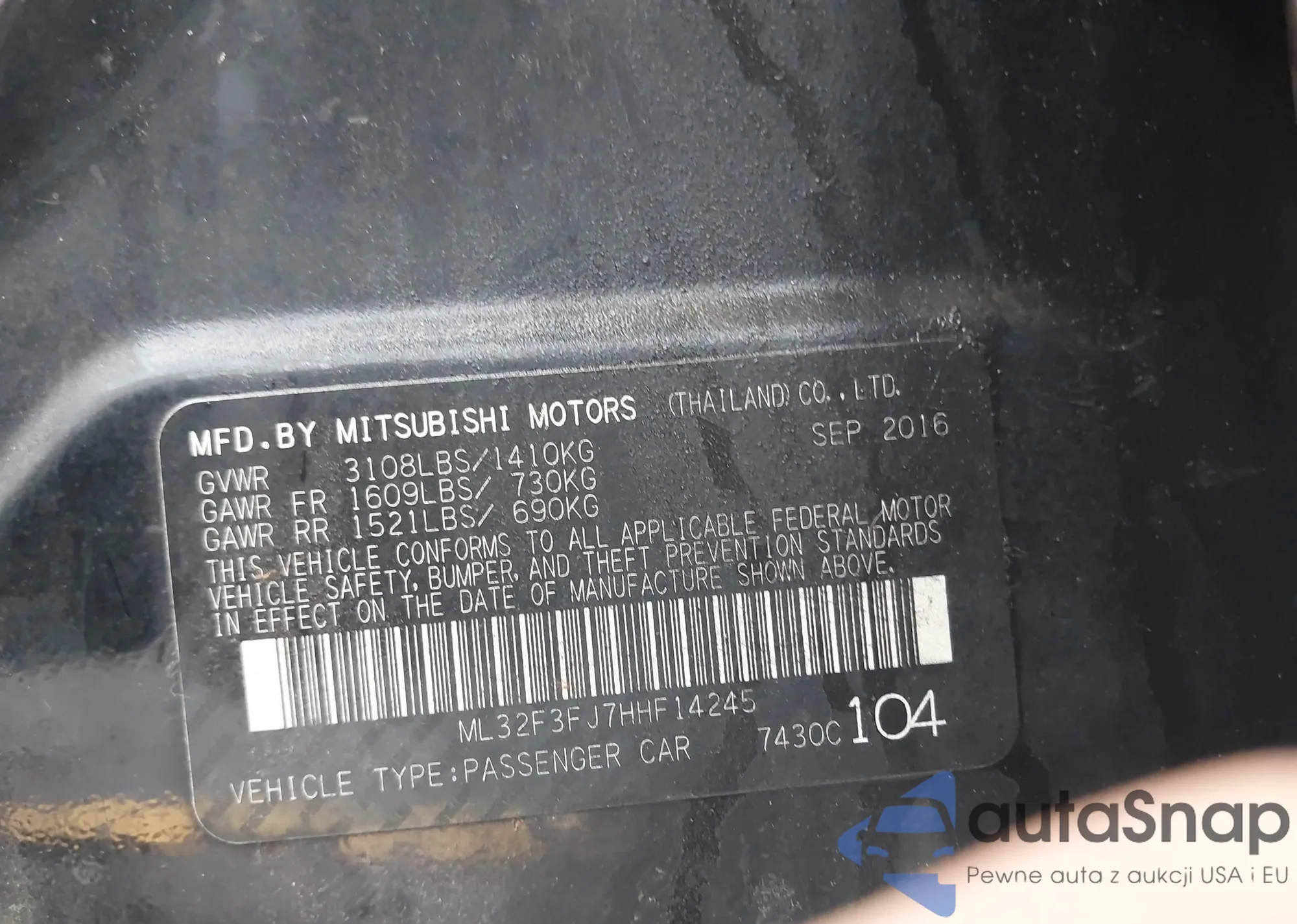 Samochód Mitsubishi Mirage 2017 (VIN ML32F3FJ7HHF14245) nie był wcześniej licytowany. Dokumenty są czyste, przebieg odpowiada lub jest niższy niż średnia rynku. Sprzedaje go firma ubezpieczeniowa – polecamy zakup. Dostawa do portu zajmie ok. 6–8 tygodni.