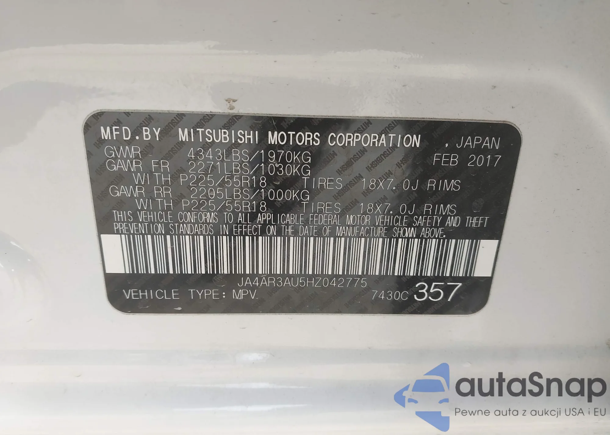 • VIN: JA4AR3AU5HZ042775